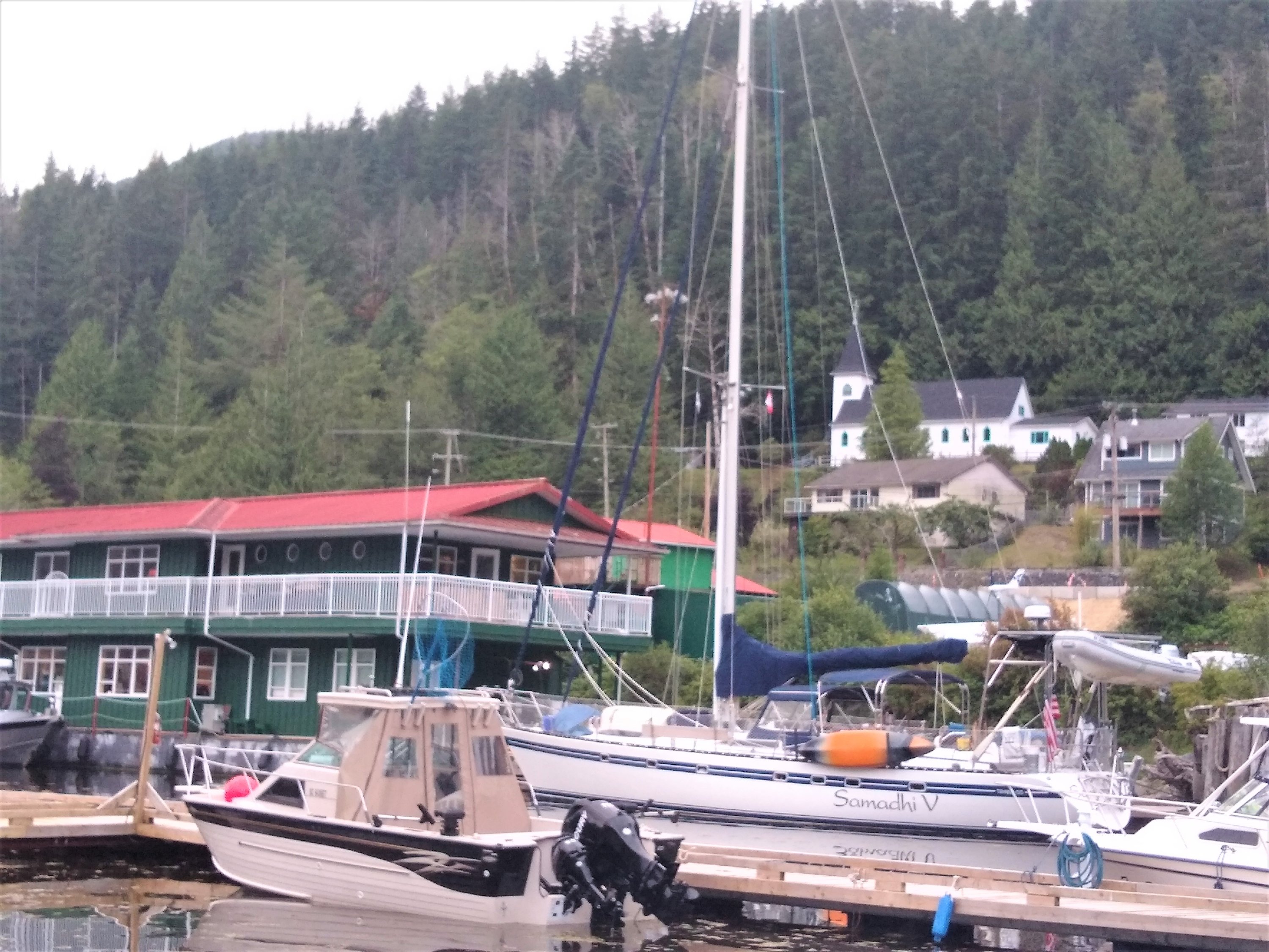 Sunday morning we slept in a bit. It was well after 10pm when we returned to Samadhi from the previous evening’s campfire. We got ourselves prepared to time our passage up Tahsis Inlet on the incoming tide so there was no rush to get moving; sleeping in felt great. We weren’t able to sail up the inlet but seeing quite a few sea otters made up for the constant noise of the motor. Up until this passage we had only seen single otters, while cute it didn’t compare to seeing an entire raft of them. We have rarely left the dock without seeing Dahls porpoise, have often seen orca, an occasional minke, fin or humpback whale and we’ve seen hundreds of river otters (right up close and personal as they lived on the marina docks). Never mind harbor seals and sea lions – this family has seen thousands. We joke that the kids have no idea how their life experiences differ from so many kids because they no longer even bat an eye at seeing the previously listed wildlife. Sea otters in the wild, however, was an awe inspiring experience for all of us. We think, and maybe we’re giving them too much credit here, that today Victoria and Alexander really realized what our family adventure is all about just by seeing those cute, cuddly little creatures floating on their backs with their adorable paws touching their whiskered faces in what looks like surprise. We hope they understand as we continue our explorations what we’re doing this for and how their lives are different than the norm. Everyone was flying high from the experience and Dan even offered to go below and wash the dishes so I could continue watching for otters. I wasn’t going to say no to that so my high continued. UNTIL a black boat with flashing blue lights pulled up alongside and asked to board our boat, I was being board by the Royal Canadian Police. On top of that as they pulled up they called me “sir”. I’ll admit I haven’t been doing my hair but I was wearing a pink coat! Likely they were confused by the woman driving with the man down below with soapy hands and a dishtowel over his shoulder. Anyway, they were very friendly and checked out a few things and stayed with us for about 10 minutes for a chit chat. After they left we made contact with the marina we were staying in for the night. We knew that the marina is for small sport fishing boats and had specifically asked about the logistics of us getting into the marina, the slip and our ability to subsequently maneuver our exit. As we pulled alongside the marina we discovered that maybe they hadn’t ever had a 55 foot sailboat on the inside float. A few dock lines and fenders had to be moved, we had to reevaluate our entrance and exit strategies but after about 5 minutes we were docked without incident. Dan did a great job anticipating how Samadhi does not maneuver and adjust according using patience and knowing how to get her to maneuver even if it means we have to briefly go the opposite direction we want to go. He’s amazing and a crowd gathered to watch our show. They literally have about 95% of the docks filled with 25’ or less sport fishing boats and the rest a little bit larger old fishing boats, Samadhi was quite a sight in with them, and we more than once heard comments like “what are they doing here?!?”. The backdrop was amazing and the marina had laundry, showers, fresh water at the docks, diesel at the fuel dock and a little bar & grill. They even let Dan & Victoria take their car to the village for a little grocery shopping. They have a fish cleaning / processing facility at the dock and the eagles loved the leftovers. At one point there were 11 eagles enjoying a free meal. You’d think an eagle would have a fierce screeching call but it is really more of a sing-song tweeting sound and we fell asleep listening to them just outside the boat.