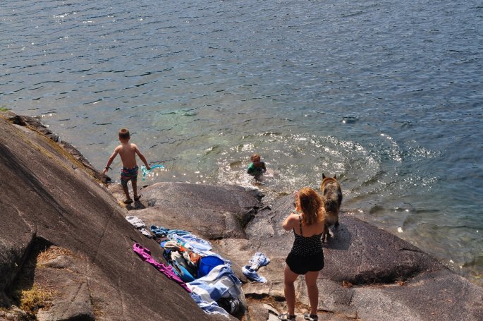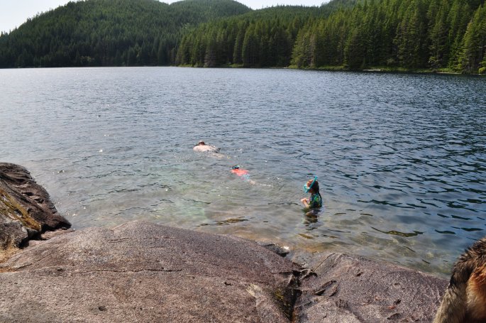 Our next obstacle to getting into Desolation Sound is Johnstone Strait. As with crossing a bar you need to time your passage with the tide so you aren’t fighting current. We found anchorage in Small Inlet just on the north side of Johnstone Strait to wait for the right time to cross. This was our first time in quite some time we were anchored in a bay with quite a few boats. There was a wonderful little hike to a fresh water lake. Often the shorelines of lakes in this area are muddy and have logs at the waterline – both often indicate leaches. Swimming in murky water and having to wade through mud aren’t fun for anyone (well except Dan and Alexander). Add in the worry of catching a leach and no thank you. Newton Lake had a great swimming rock which eliminated that worry. Between a hiking trail to stretch our legs and fresh water swimming we spent longer than anticipated at Small Inlet, 3 nights total. We eventually grew restless to get to Desolation Sound so timed our leave to get through Johnstone Strait. We weren’t the only ones and found ourselves in procession with 6 pleasure boats and 2 tugboats pulling barges south in Johnstone Strait. We stopped for about an hour in the town of Campbell River for a final provision of fresh food and continued on to Desolation Sound. We once again found ourselves entering our anchorage for the night right at dinner time (it’s as if we always time our departure each day to coincide with arriving at the next place right at dinner). We had finally arrived at Prideaux Haven, we were in Desolation Sound!
