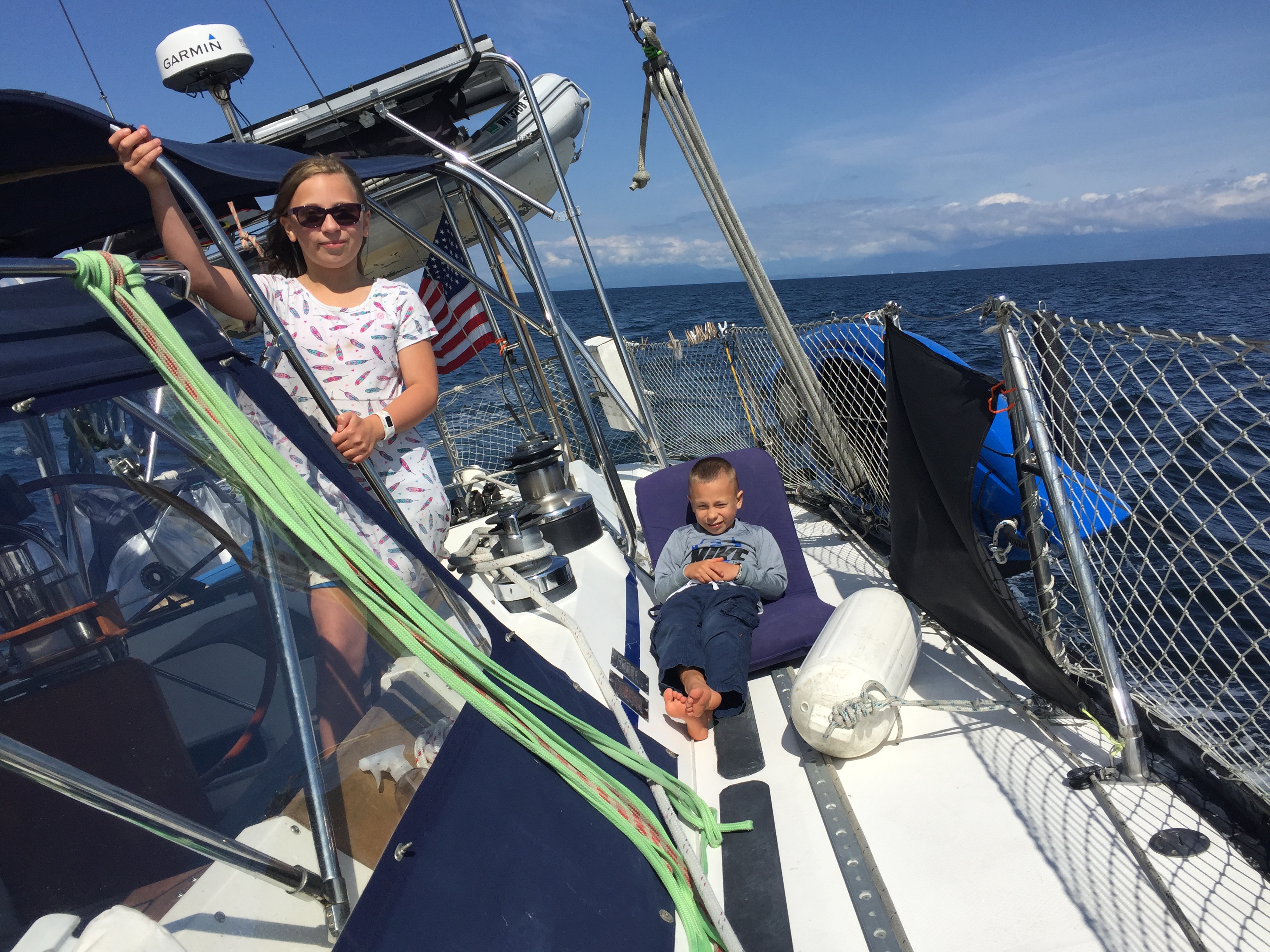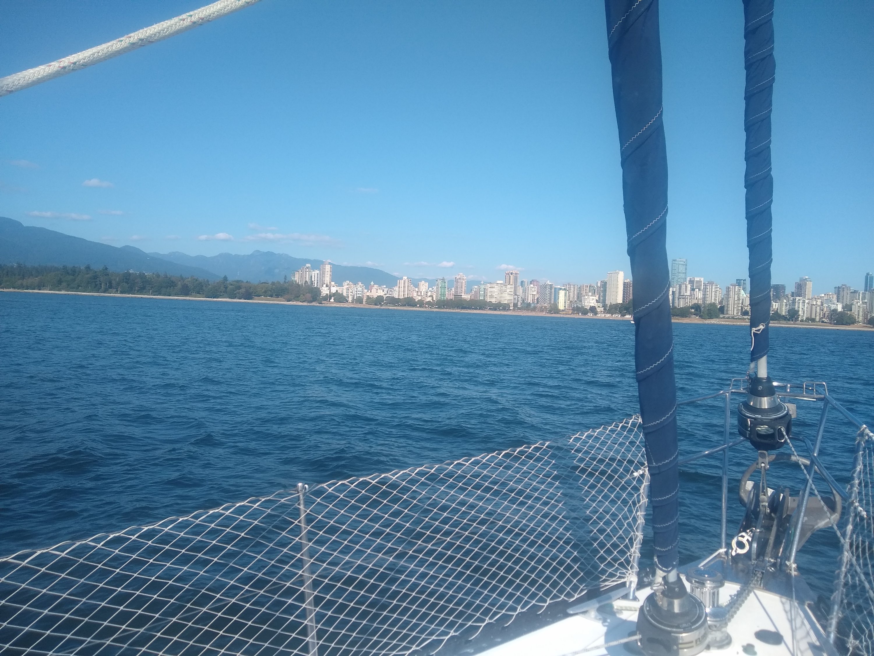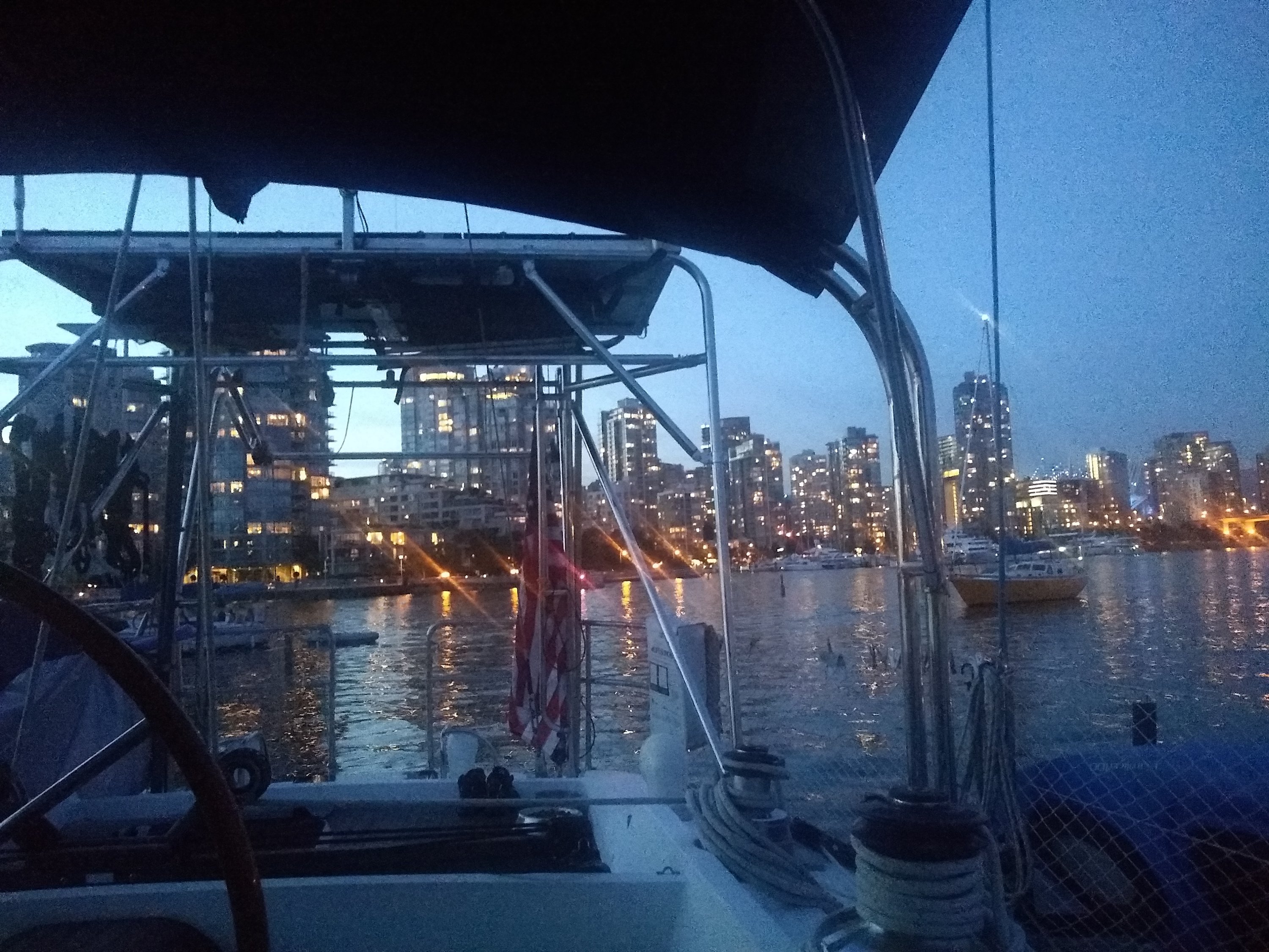 We left Grace Harbor in the late morning with the intention of heading as far south as we could get before we felt like stopping. After a nice peaceful trip down the northern part of the Strait of Georgia we anchored for the evening at a nice park called Buccaneer Bay just south of Texada Island. We planned on continuing south to Vancouver the next day. We were a little low on water and we were anxious to get back to civilization. We had had little contact if any with friends and we were sure that grandparents were more than a little short on time spent talking to Victoria and Alexander. The next day called for winds above 20 knots coming from the south beginning in the early afternoon. This was definitely not ideal but we figured we could get an early start and be into Vancouver before the higher winds came. We pulled up the anchor at 7am for the 45 mile run to Vancouver. As we rounded the north end of North Thormanby Island the winds and the seas reminded us that weather forecasts are just that, forecasts. The winds were already above 25 knots at times bumping to just below 30 and the seas were 2 to 3 meters. This is not ideal particularly when you are trying to beat into these winds and waves. We decided to soldier on so we reefed the main and headed out across the straights to begin our tacking course south. After about 4 hours of great sailing but not lots of headway we decided to head back to where we started. This time we went into a nice little harbor called Secret Harbor and anchored just of the marina for the night. The next morning we filled our water tanks at their fuel dock and set off south again to Vancouver. The winds and seas were still coming from the same direction however they had eased slightly to 20knots and about 1.5 to 2.5 meters. We had another great sail however this time we made much better progress to our destination. The distance between our start point and our destination was 40 miles as the crow flies. We traveled 70 miles to get there as we had to tack back and forth across the Straits of Georgia. But hey, that is how it goes sometimes when you use wind as your engine. We had a great day with the kids doing school work, having breakfast, lunch and dinner and finding ways to entertain themselves all while the boat heeled to the stiff breeze and crashed through the large seas. We anchored in False Creek Vancouver just before sunset.