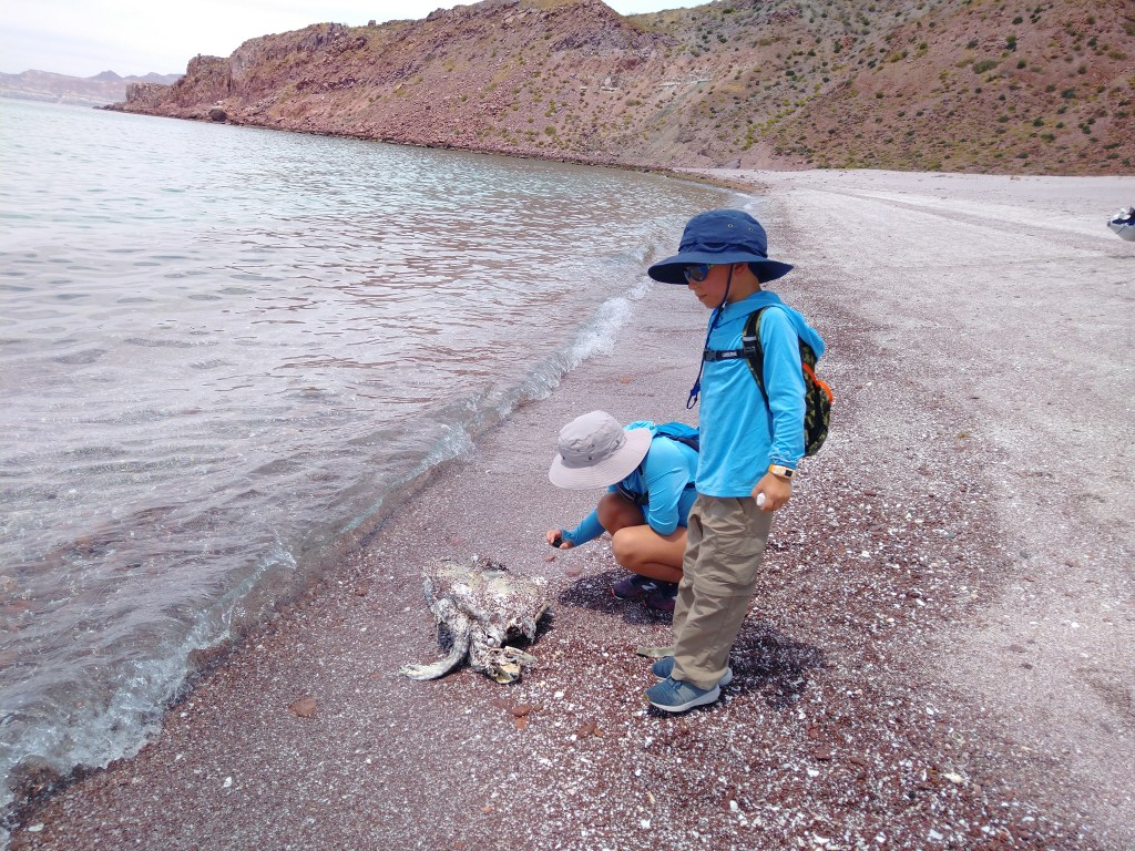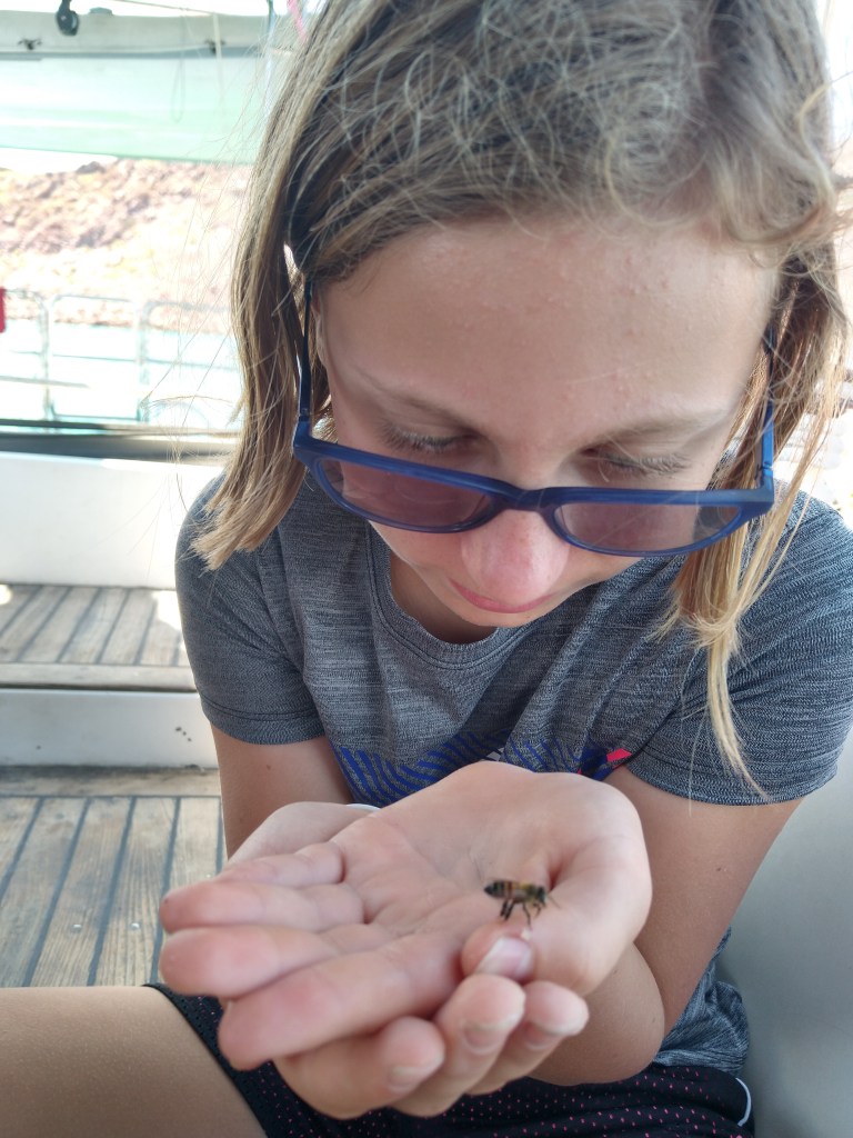 Finally our other neighbors are a little less helpful but nearly as much appreciated. As you all may remember we are actually in a desert environment which means fresh water is very hard to find for animals and insects that live on land. And for the animals or insects that can fly they are smart enough to check the tiny floating islands that come and go from time to time, otherwise known as boats. Many of you may also remember that one of the things Victoria and Alexander miss the most about not living on land is beekeeping. They both loved tending to our honeybees on our property. Honeybees need lots of freshwater to maintain their hives and as I have said above, freshwater is very hard to come by around here. So cruisers are told to keep all freshwater covered so that you do not attract bees because they will rush to the water en masse. Well, that is not what the Murphy’s do. We have cookie sheets of freshwater on our deck as well as buckets full of freshwater stationed all around our boat. The buckets have ropes draped into the water for the bees to climb out if they get stuck. At any given time during the day there are a few hundred bees coming and going to our water offerings. Victoria and Alexander are always watching the buckets for bees struggling to get out of the water. If it looks like one needs help they are quick to reach their bare hands and arms past the 50 or 60 bees surrounding the edges and into the water to pick up, yes pick up, the bee and return her to safety. Honey Bee colonies are collapsing all around the world, we all need to do our part to help when and where we can. Giving them a little extra water and saving any drowning bees is how Victoria and Alexander help the honey bees.