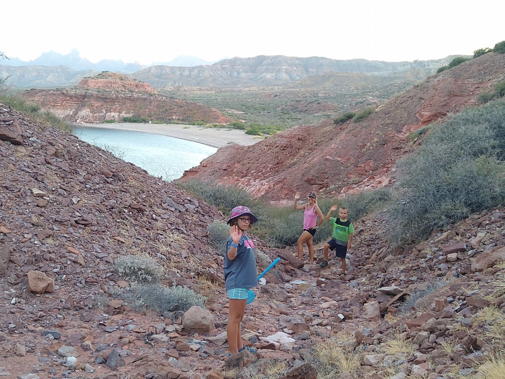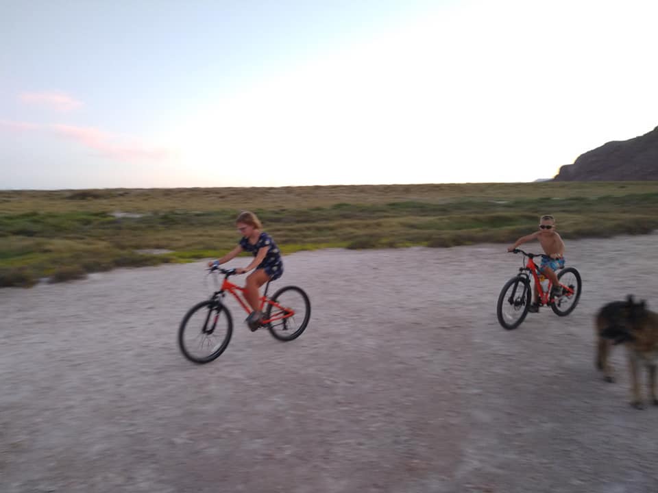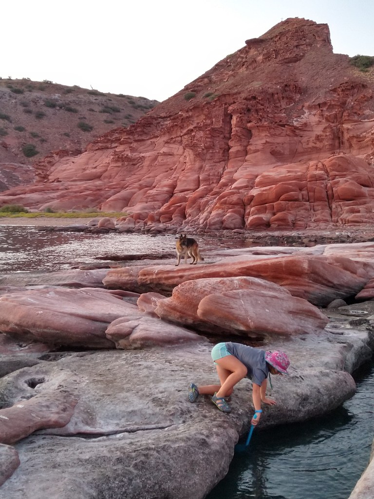 We left La Paz early in the morning bound for our favorite place Isla San Francisco. As soon as we cleared the channel out of La Paz we turned off the engine, raised the sailed (including the spinnaker) and pointed our bow north. After helping with the sails Victoria and Alexander went below and began their school day. Ashley and I took turns keeping watch on the sails while the other supervised the lessons. We sailed the entire 50ish miles to Isla San Francisco. We had a nice calm evening and next morning so it was difficult for us all to say goodbye to what we all have began calling home. But we know that there was more to see so we raised the anchor and said “see ya later” to Isla San Francisco. After we left the bay we again raised the sails and headed north. Our destination was a place called Los Gatos. The winds were from the south again with a gentle following sea. We sailed slowly to our destination only dropping the sails at the entrance to the bay. We spent two days at Los Gatos climbing on the red rocks and exploring the amazing formations carved by wind and tides. We had two fantastic days at Los Gatos but the anchorage was not particularly protected so we knew that we were not going to stay long. So on the third day we again set sail heading north. Our next destination was a small village called Agua Verde. We again had perfect conditions for sailing so we took full advantage. The winds were 8-12knots from the southeast and we were heading due north. After setting the sailing (and again the spinnaker) we turned on the autopilot and did not touch the wheel or a rope or adjust a sail until just outside of Agua Verde. Agua Verde is a small fishing village with a population of about 200 people and an equal number of goats. There is a goat dairy near the town. The people of Agua Verde are known throughout the Sea of Cortez as extremely kind and welcoming to visitors. We have had Agua Verde on our list of places to visit since long before me left Seattle. However, the covid situation kept us from being able to go into town and interact with the locals. It was not because we were afraid of contracting the virus from the village it was that we had not been isolated for 14 days yet and did not want to accidently bring the virus to the naturally isolated village. So despite the numerous invitations from the fishermen passing by to come into town we raised anchor and yet again headed north. The southerly wind patterns continued pushing us north. Daily life continued as Samadhi sailed along on the gentle breeze and smooth seas. Alexander and Victoria have both started the next grade level. Victoria is now a 4th grader and Alexander is now a 2nd grader (we don’t have summer breaks in the Murphy Academy). Ashley baked a cake. And Ranger and I listened to an audio book while keeping watch as we made the 30 mile passage to Honeymoon Cove near Puerto Escondido. On our way we passed through a mega pod of dolphins. There were hundreds, and I mean HUNDREDS of dolphins in all directions surrounding the boat. They were jumping, doing flips and putting on quite a show for us. They would swim right at the boat and then dive under and off again. There seem to be a variety of species of dolphins including the rarely seen Dusky Dolphins which are very small dolphins. We also saw a few baby bottlenose dolphins. We arrived at our destination early in the evening with enough time to get settled, take Ranger to shore and see a little of the beach we anchored in front of. The next day we explored the beach and hills above as well as spent time snorkeling in the warm, turquoise waters. Tomorrow we will be sailing past the town of Lareto and we are told we will have cell service as we pass, hopefully enough for me to post this. We will continue heading north to a place called San Juanico where we will be able to spend a week or so in one place. We plan to meet up with other kid boats so after everyone has had 14 days of isolation we can all be isolated together as we play, explore, learn and live in the Sea of Cortez.