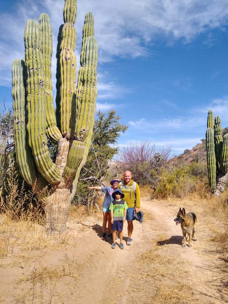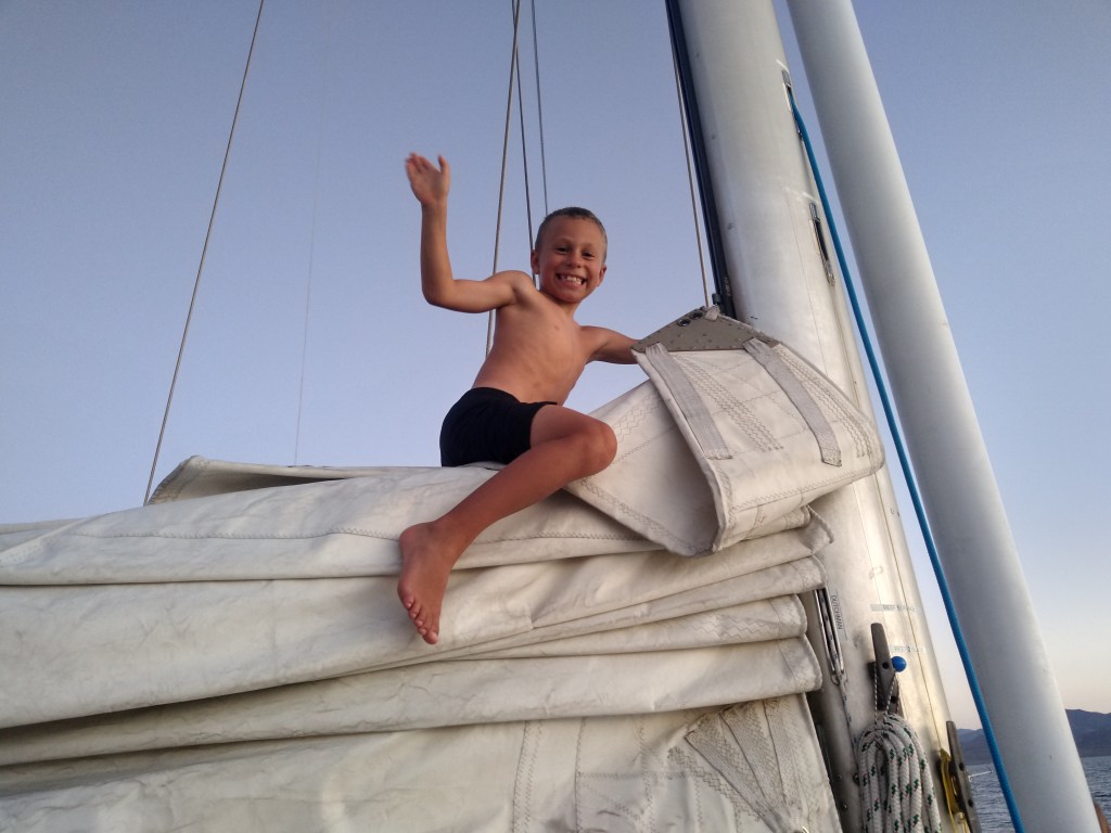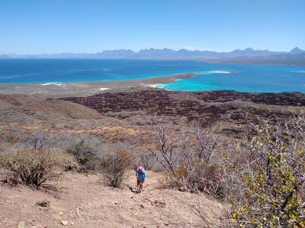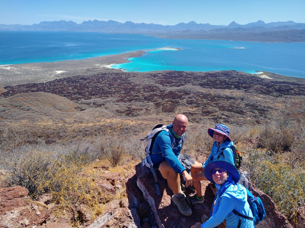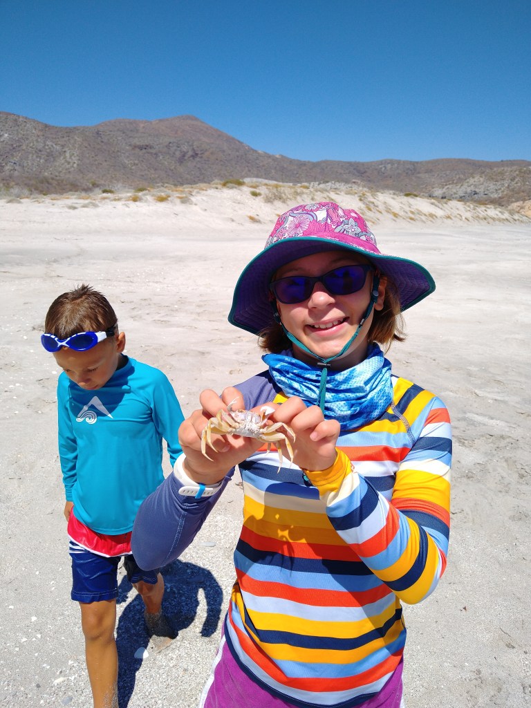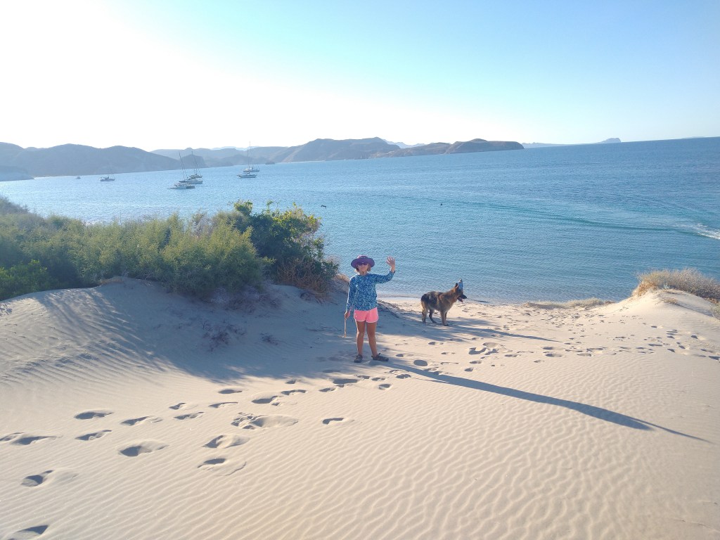 Our guidebooks said that Isla Coronados was a long extinct volcano with a demanding trail to the top. However, the sign we found at Honeymoon Cove said that Ranger was not allowed on that island either. So we all were pretty bummed about not being able to climb the volcano. But as we sailed closer to the cove shaped island we all knew what we each were thinking. We need to stop and climb that thing! When Ashley and I told the kids we were going to stop, both and Alexander and Victoria were ecstatic and began reading their hydration packs. So instead of sailing by we sailed into the anchorage and dropped anchor. It was a little late in the day when we began our hike. Normally by noon it is in the mid 80’s as it climbs to the 90’s in the afternoon. We knew we were not going to stay long because Ranger was not able to hike with us or even go to the beach so we set out on our hike right away. It was after one in the afternoon when we began the ascent. At first it was a lovely groomed trail through the dunes. Soon, however, that all changed. The trail went from smooth sand to large grapefruit sized obsidian rocks with super sharp edges. We walked on these rocks for nearly two miles up and down small ravines and through draws and spurs of the volcano. After the ankle busting rock trail we came out to the face of the cone of the peak. The trail took the direct approach to the summit with only slight switch backs up a narrow draw of very loose sand. Soon we reached the summit that gave us all magnificent views of the anchorage and surrounding sea. We spent a little time exploring the crater and then made our way back to the beach. Waiting for us at the beach were our friends from S/V Galatea. We had not yet reached 14 days of isolation so Alexander and Connor were able to play but keep their distance from each other. After the hike soaking our feet in the salt water and soft sound was very refreshing. Later when we all got back to the boat we decided that the guidebook was right when it described the hike as demanding. We also decided that it was a hike we would never do again.