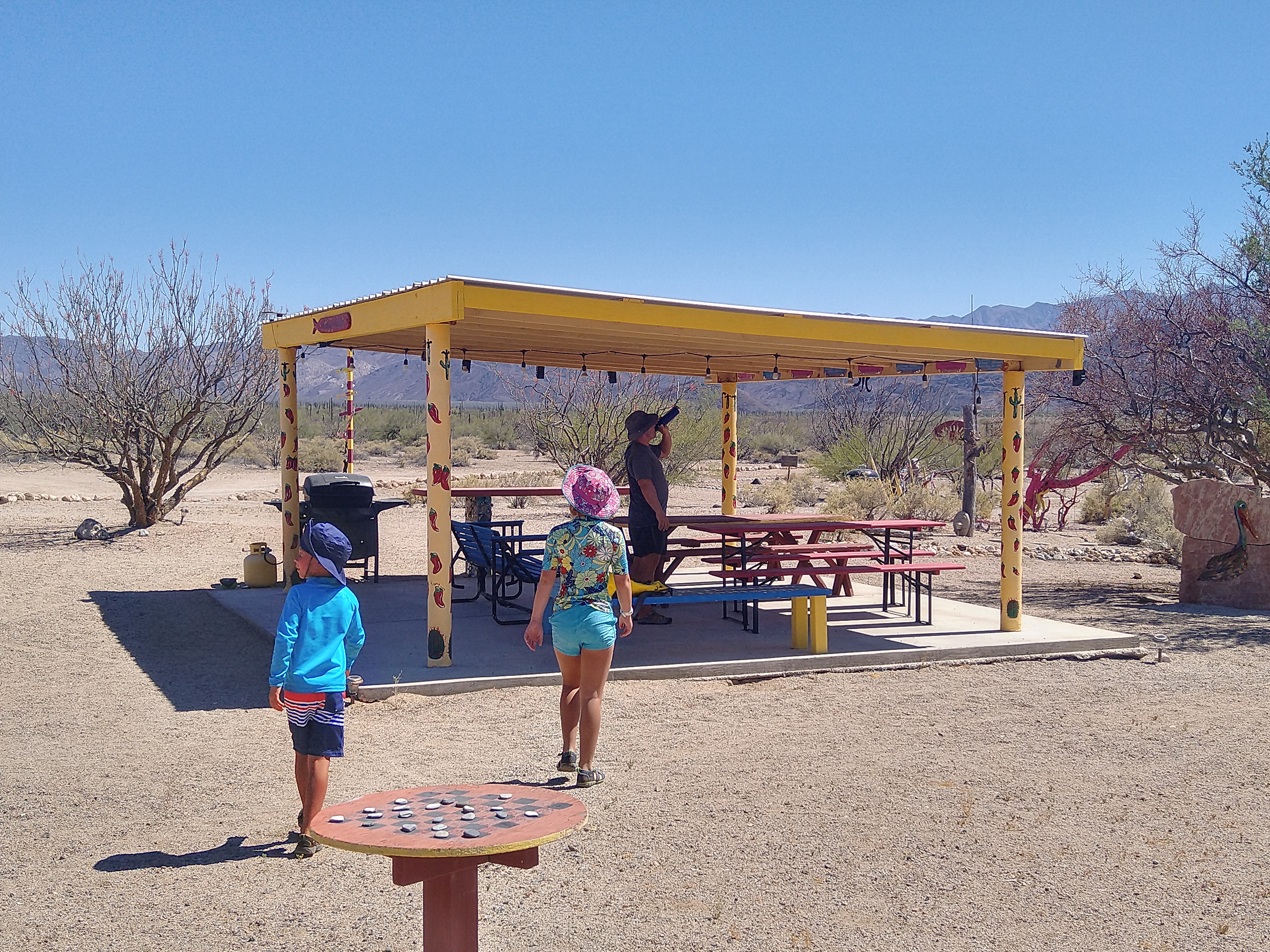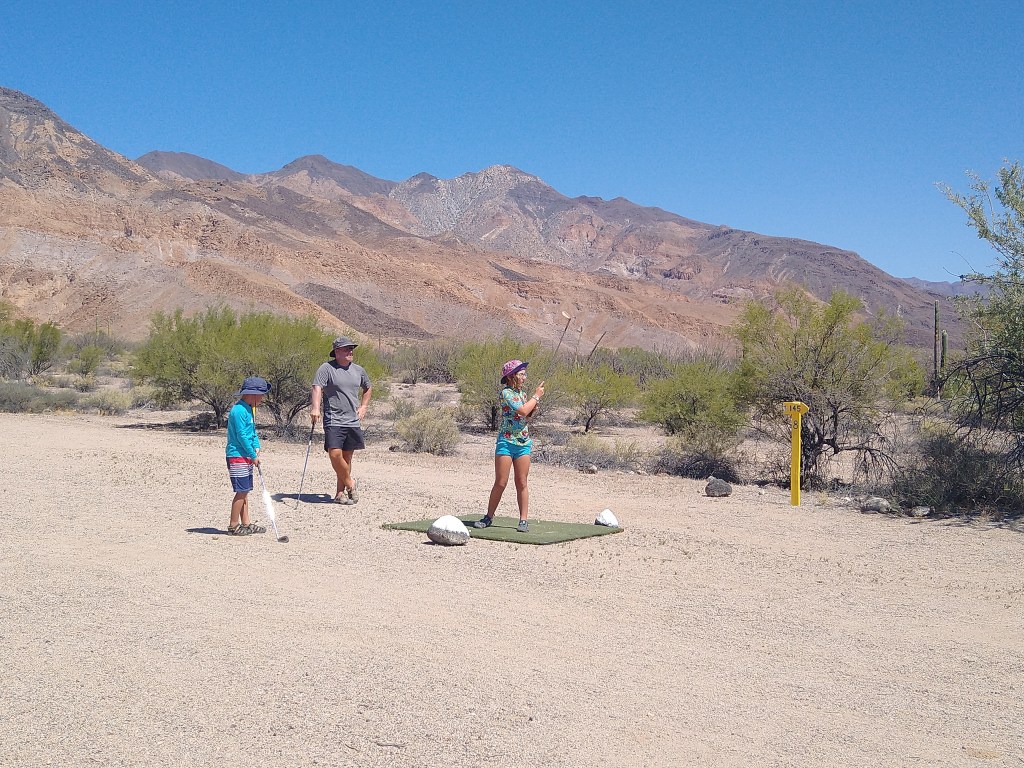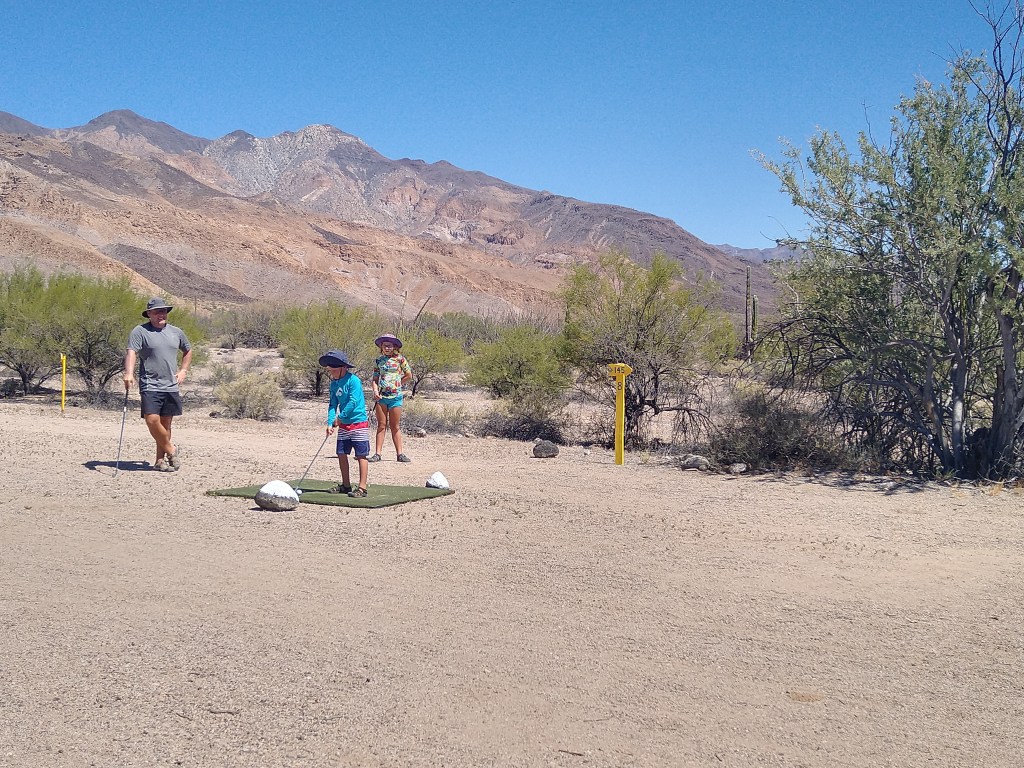 We anchored right off a beautiful sand beach that separated the Sea for a glimmering blue lagoon. At high tide we kayaked into the lagoon. We brought our snorkeling gear and paddleboard so we could explore and sea all of the wildlife taking advantage of the nutrient rich lagoon. It was truly magnificent. The water was warm and clear. There were fish everywhere along with rays and terns flying over head. The sun overhead made it all shine thousands of different colors as the shallow water reflected the light. And 4 hours later all the water was gone as the tide went out and left the lagoon land locked until the next high tide. It was such a beautiful place. One day as we were getting ready for another trip into the lagoon Ashley spotted what appeared to be a mirror floating on the water. We were told early from some people that we met that that was how you recognize a whale shark. So we all rush to the dinghy and went out to investigate. Now the whale sharks frequent this area but not usually until July and August and it was only June. So we were not overly confident we would see one before we had to leave. As we got closer in the (10 ft long) dinghy we saw right away that it was indeed a whale shark and its mouth was wide open and swimming directly for us! I drove us out of his path and we watched as he swam passed us. It was a small whale shark but it was still at least 15ft long. We followed him at a safe distance for about 5 minutes and then he was gone. Sorry for no picture but neither, Ashley or I, wanted to miss one moment of this awesome creature. Later that day we visited the house of some part time residents who were isolating from covid in a small neighborhood across the bay from the small town. This neighborhood consisted of about 30 homes all off grid and self sufficient. They all got together and made a small golf course and park out of their shared desert backyards. They welcomed our family to explore the neighborhood and play a round of golf. We had a great time looking at the houses, checking out the homemade park and playing a little golf.
