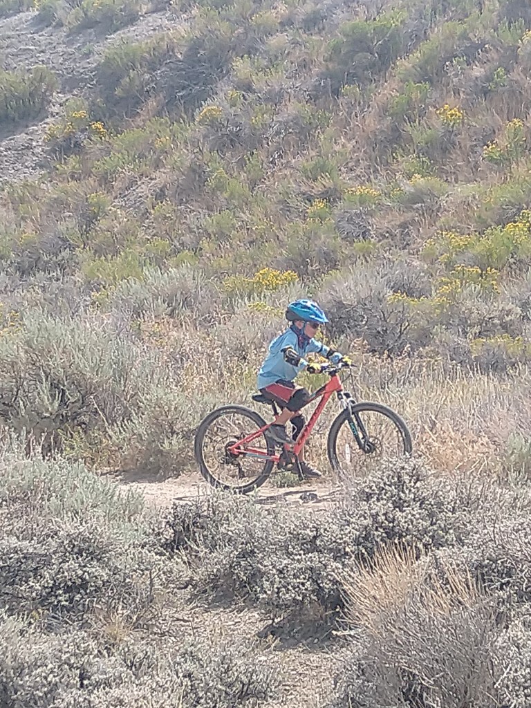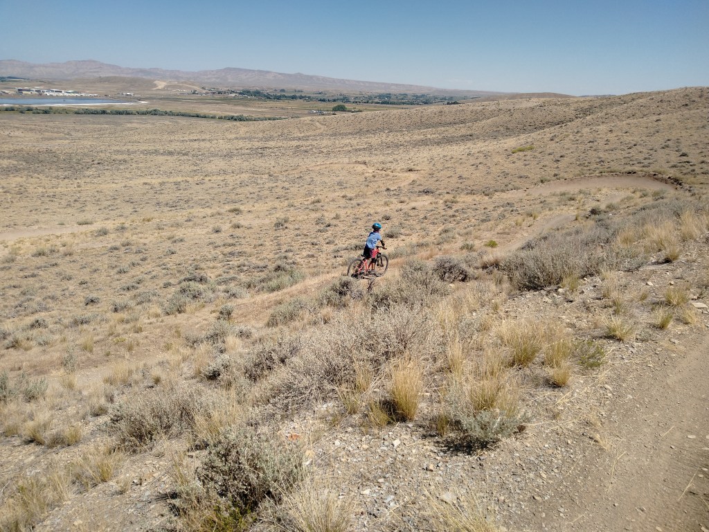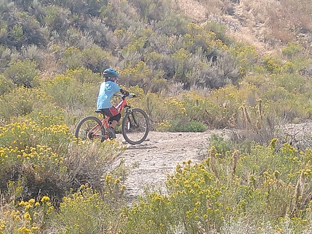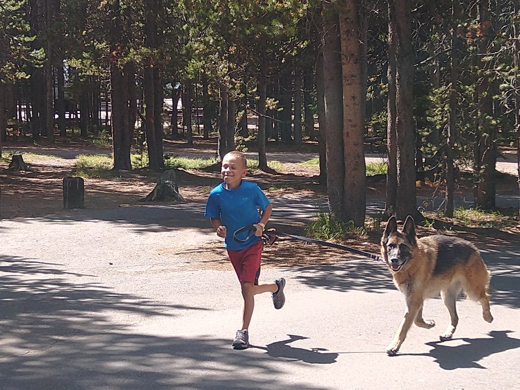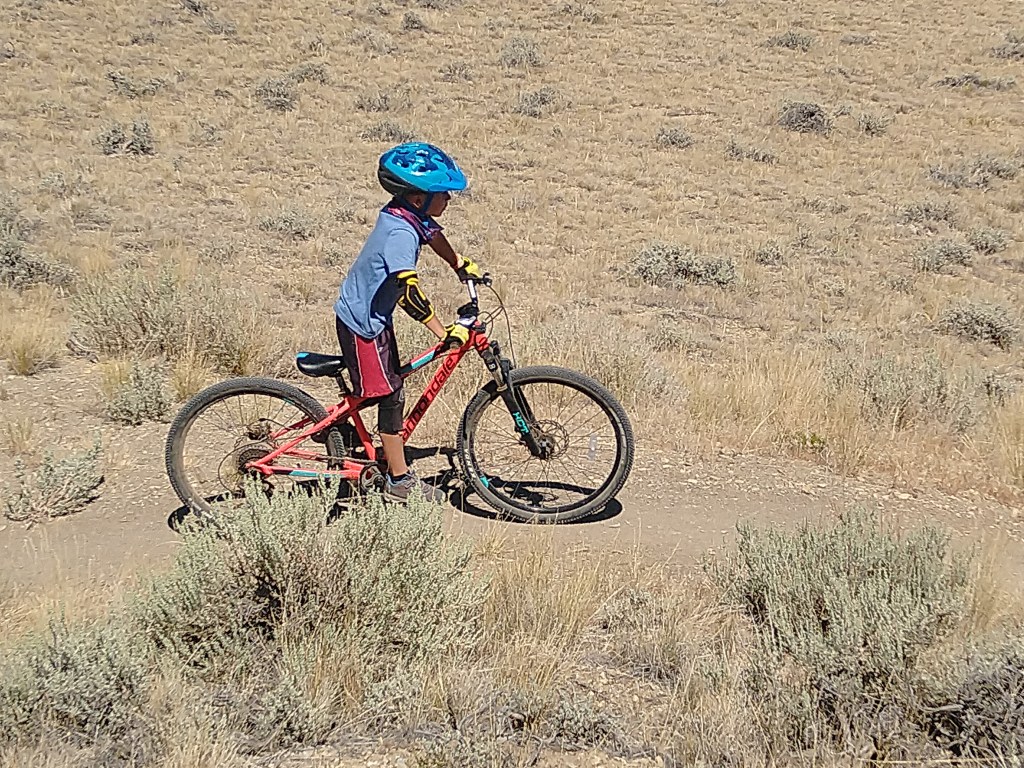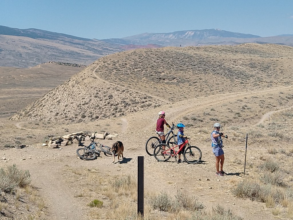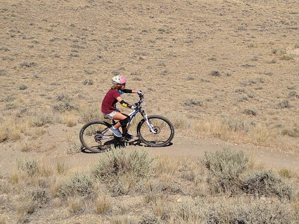 We had a few days between our reservations in The Grand Tetons and our reservations in Yellowstone. We decided to spend those days in the small town of Cody Wyoming just outside of Yellowstone. We met my parents in a nice campground alongside a river and nearby a large reservoir. The campground was 15 miles from the town of Cody so we were able to easily visit the grocery store and run necessary errands. The town of Cody had an amazing county park that had a small lake for fishing and swimming. It had a nice sized off leash dog-park. There was a paved path around the small lake for road bikes and jogging. But most impressive was the bike park. The county built a wonderland of short fast downhill runs with either jumps or drops for the beginner to expert mountain bikers. They also built a large pump track that was suitable for tiny riders yet was enjoyable for all levels of riders. We spent hours and hours at this bike park blasting down the jump route reaching higher speeds and getting more air with each run. When we needed a break from the jumping we would go down the run with drops and big banking turns so that we had to climb back on a technical rocky path to get back to the top. One loop of either of the runs was only about ¼ of a mile so Victoria and Alexander were able to make dozens and dozens of runs on each of the paths. On our second visit to the bike park we brought along Grandma and Grandpa with their bikes. After some convincing even Grandma Murphy went down the jump run, albeit a little slower than Alexander and Victoria. There were three teenagers at the park that we were taking turns with. They were all amazed to see a Grandma going down the jump run. And they just amazed to see a 7 year old follow her down while getting air on most of the jumps. After some time at the bike park we all set out into the trail system that is attached to the county park. We all went on a nice 6 mile mountain bike ride. The ride was rather simple with very little obstacles other than the climbing at an elevation of 7500ft. After some riding Grandma and Grandpa decided to take a slightly less uphill route back to the car while the four of us pushed on to the top of the hill. It was pretty tough getting to the top with the thin air causing us all to feel super winded, but we all made it. Once we started down the winding and twisting single track trail down the struggle to get to the top seemed completely worth it. Alexander took point with Victoria right on his heels. I followed and Ashley brought up the rear with Ranger. I told the kids to take it easy and watch for unseen obstacles behind the jumps or around the corners. They both said “sure dad” and then they were gone! Just like that they were bombing down the hillside launching off the many jumps and table tops barely breaking on the banking turns. I was behind the two of them and I don’t think I would have ridden down any faster if they were not in front of me. It was a total blast both the ride and the fact that both kids were tearing it up. When we got near the bottom we came into a herd of cows. I thought it would be best if I got to the front to chase the cows off the trail. So I led us through the herd, but once we were out of the herd I took off to finish the last of the downhill at full speed. After about 3-4 minutes of all out downhill riding I looked back expecting to see Alexander and Victoria far behind. Nope, Alexander was right on my back wheel and Victoria just behind him. Both of them grinning ear to ear just like their dad. We finished the ride shortly thereafter and there was a chorus of excited descriptions of the jumps and turns and how amazing the trail was all the way back to the campground.