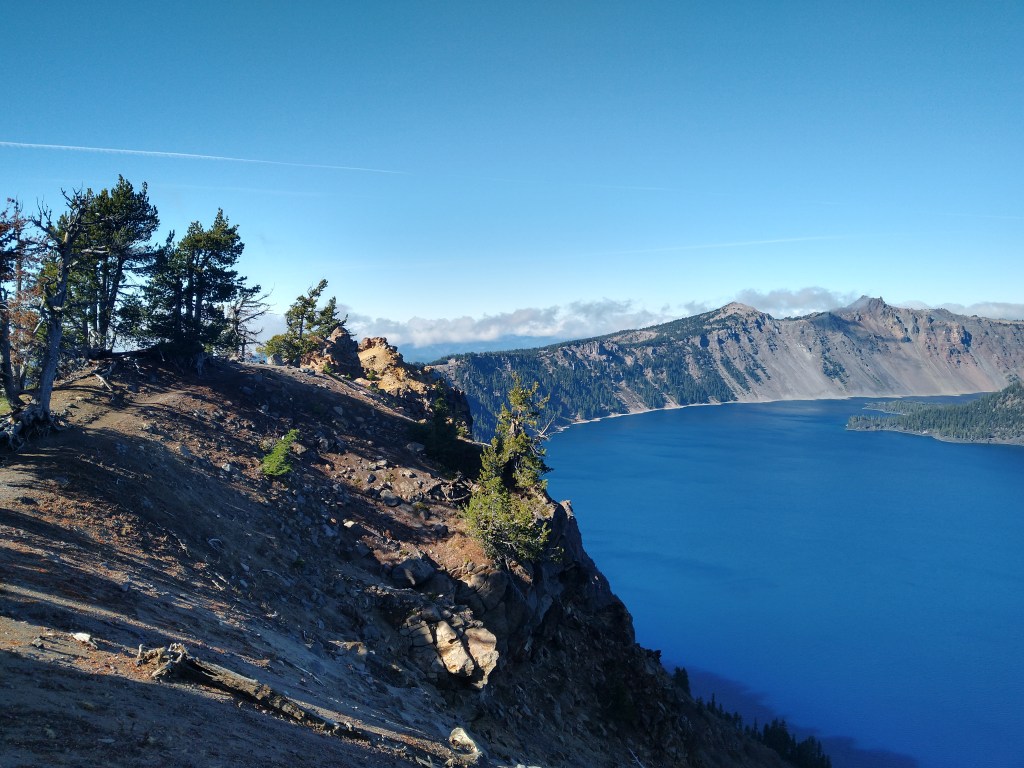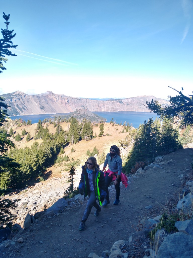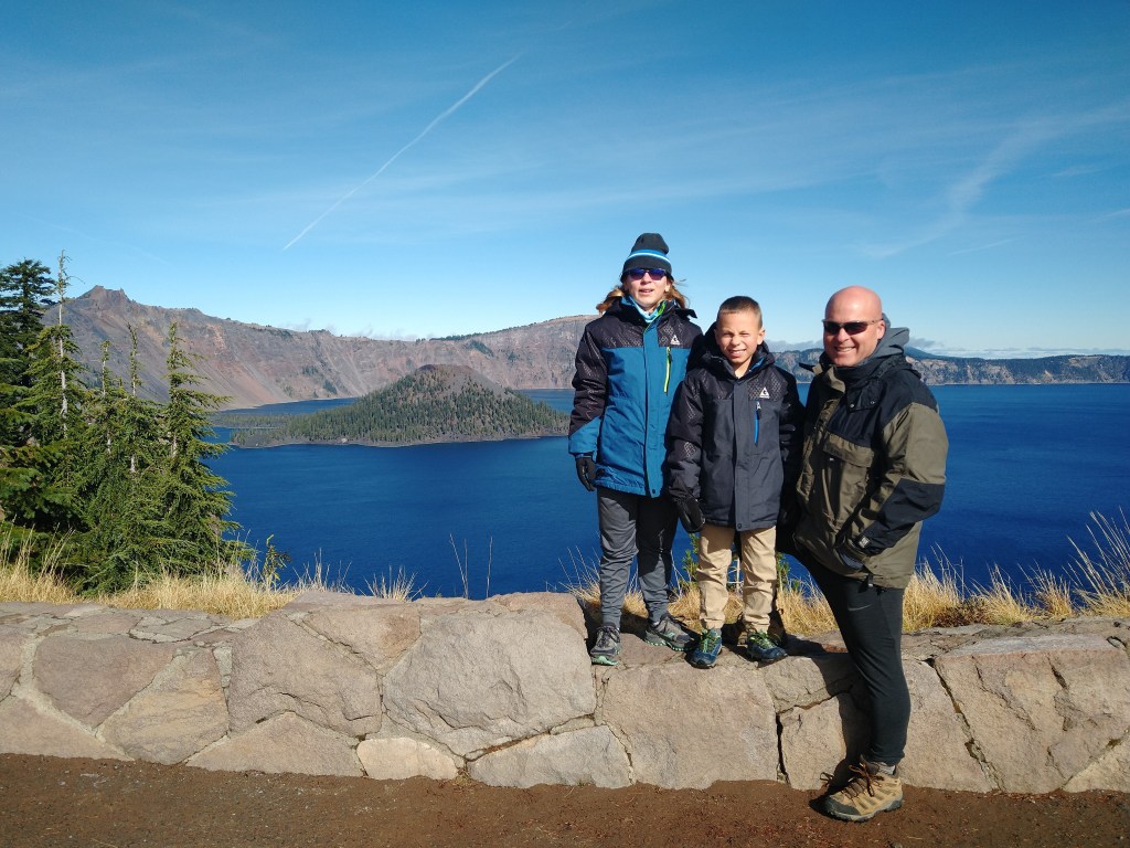 We are on our way south to get back to the summer weather that we have become accustomed to. However, we were so close to one of the most beautiful sites in the entire world, so we just had to stop and see Crater Lake. Ashley found a nice state park 30 miles from the entrance to Crater Lake so we stopped there for the remainder of our 10 free days in Oregon. We got up early in the morning and loaded our cold weather clothes in the car. Near the crater the temperatures were in the mid 30s while at the campground the temperatures were in the 60s. As we drove to the summit I told Alexander and Victoria about how beautiful the lake will be. They both have visited many places that offer some amazing scenery so I was curious as to what their reaction would be when they see the lake. As we neared the craters edge they kept catching quick peek a boo glimpses of the lake but never the full view. Once we parked the car the kids put on their warm clothes and rushed over to the viewpoint. It was really special seeing them react to the amazing views that Crater Lake offers its visitors. They would not stop talking about the blue of the lake and how it looked just like a crater of a volcano. We decided to take a hike up to a ridge that gave an even better view of the lake and crater. At the top of the hike Victoria and Alexander were gushing on and on about how beautiful and natural their surrounding were and how great it made them feel. Before hiking to the viewpoint we stopped and read about how the lake was formed and why its water is so pure. Alexander and Victoria pointed out many of the features that we learned about in the reading when we were on the summit of our hike overlooking the lake.