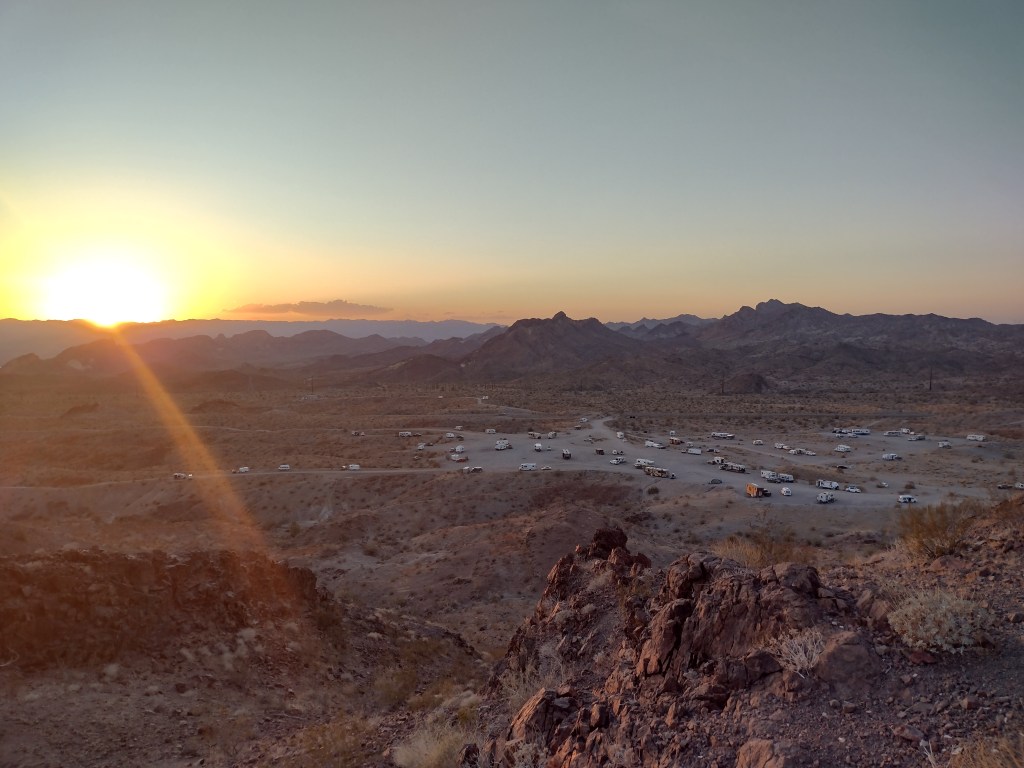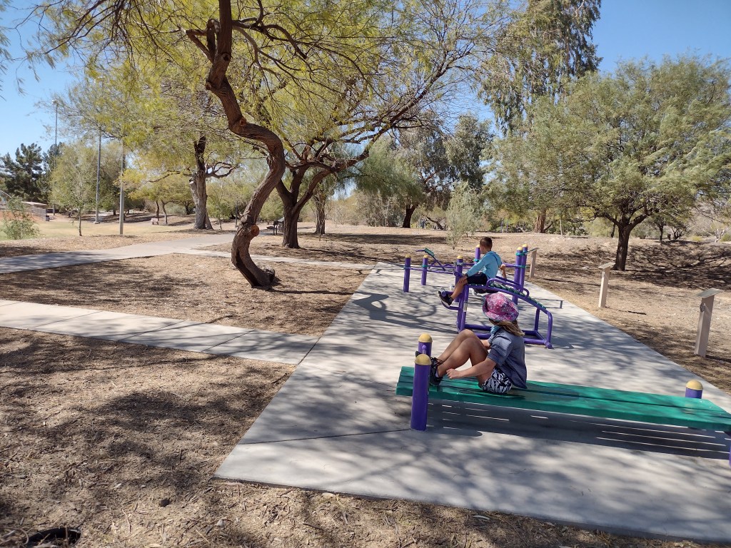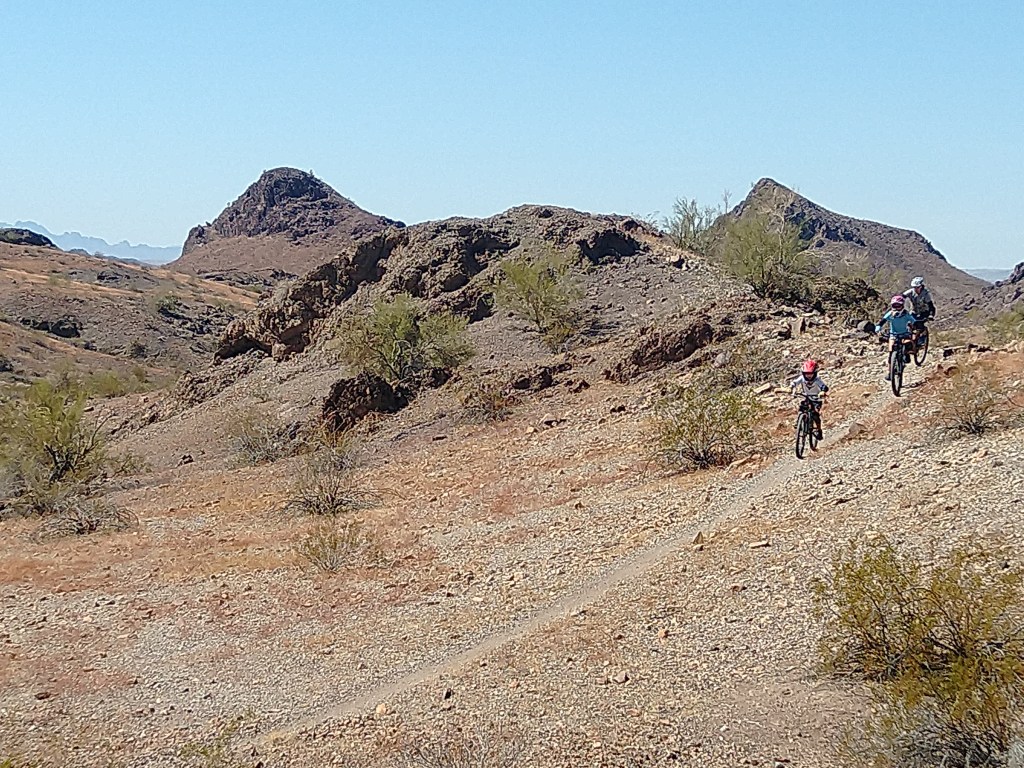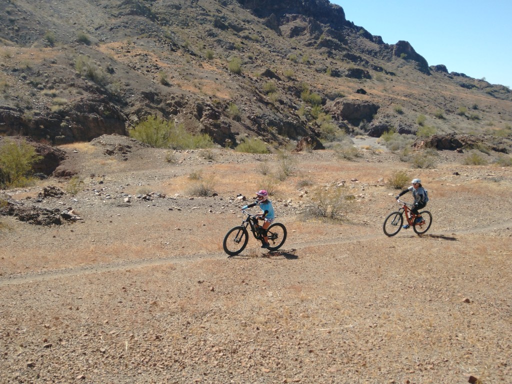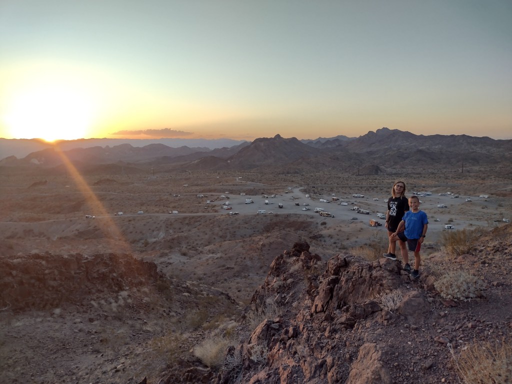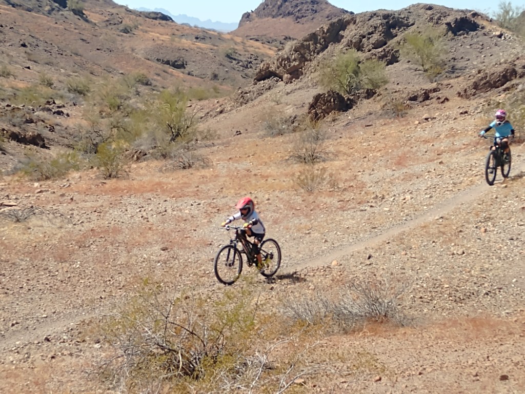 sert but the scenery here was pretty cool even without the big evergreen trees that we prefer. In the city we found an amazing park with 100’s of miles of mountain bike trails. We spent two days exploring these trails. They were flowing, smooth, singletrack trails. They took us up hillsides, along ridgelines, down into sandy washes and thru beautiful valleys. Again the rocky, hilly, rugged terrain was actually quite beautiful. In the town we found an amazing city park that had some really great attractions. The park had a 1 mile paved loop with exercise stations along the route. We took advantage of this and had a workout day here completing 3 laps as onlookers watched this crazy family working hard. The park was on the lake’s edge so after the workout Victoria and I cooled off in the 62 degree lake. I thought it felt great Victoria not so much. Another great thing about this park was it’s skate park. We have never seen such a comprehensive skate park before. There were obstacles for every level of skater. Victoria and Alexander rode their scooters for hours here. At a different park in the city were some pickle ball courts. Many mornings I would get up and drive to the park for some highly competitive pickle ball. At Catspa I was one of the better players by time we left. Here at Lake Havasu City I was probably at the top of the bottom half. I was able to pick up a few pointers for some of the professionals that play and practice there. We spent 10 days at the BLM land. We continued doubling up of school days, we rode out a few wind storms and I made a quick trip to Samadhi. We ended up staying a few more days than we had planned due to the beautiful and convenient location. Our plan for Lake Havasu City was just a few days stop for mountain biking. However, after experiencing everything here we would not hesitate to come back a stay a little longer, in the winter of course.