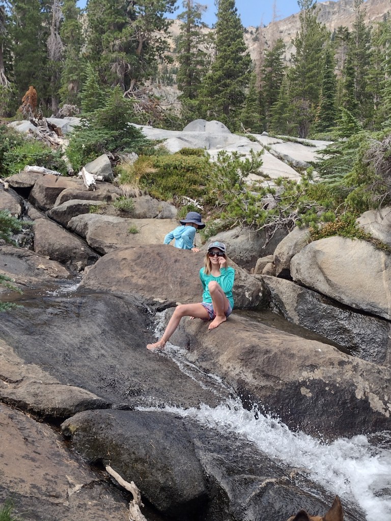 Victoria and Alexander had never backpacked other than for long day hikes. So when we loaded up the backpacks with some weight we thought it would slow them down. Nope! They took to it like naturals. When our group of 10 people plus Ranger all met at the trailhead along with a few other backpackers our kids fit right in and were able to negotiate the trails with their additional cumbersome packs like they had been doing this all along. The hike in began with a steep and rocky 3 mile climb before it leveled off as we traversed a beautiful lake basin. After a little over 5 miles we arrived at the most perfect of campsites. We all were happy to drop our packs and set up camp. After the tents were up and things properly stowed away the kids set about exploring this little piece of paradise. I do not have the words to describe this amazing place. We camped on a ½ acre granite slab of rock surrounded by small lake on one side, a smaller pond on another side and a babbling creek on the other. And all of this in a lake basin that was lined with trees and surrounded by mountain peaks. The five kids played in the water, built dams on the creek, climbed the trees and played and played and played. We all took a dip in the water just before making dinner. As night fell, we were greeted by a bright full moon that lit up the own little natural playground. The next day we did a day hike up to two other alpine lakes and to the Pacific Crest Trail. The kids had a great time talking and playing as we hiked and they also enjoyed playing in the lakes. At one of the lake Autumn saw that a pool with hundreds of tadpoles was close to drying out. So she led the other kids on a earthmoving mission that brought freshwater to the tadpoles pool and also gave them an escape into the larger lake. It was quite an undertaking and was very fun watching the kids all work together and congratulate themselves on their noble achievement. The next day as we packed up to leave I felt more than a little sad as I really did not want to say goodbye to such an amazing and breathtaking place. I also knew that at the end of the day we would be saying goodbye to our wonderful friends Team H. After a grueling 4 hour hike down we made it our cars as the crowds of Lake Tahoe tourists arrived. We fought our way through the crowds and agreed to go out to lunch together to celebrate our adventure. We had lunch near a small park that the 5 kids played in after eating. It was super difficult to finally stop their play as we had to get moving. It was particularly difficult this time as we did/do not know when we will see them again. We have met many people and families in our travels and even in our pretravel days, but never have we met a family like Team H that we have to much in common with. Will is an amazing father, motivator, guide, supporter and friend. Will took me on more than a few rides that pushed me farther than I have been push for a long time. And I loved every second of it. Will is a really great friend and I will miss hanging out with him. Karin is an amazing mother, patience, caring, and loving on one hand while also challenging, inspiring and setting a wonderful example her amazing daughters. Ashley loved how Karin always looked for ways to grow and was quick with a compliment or tip while being open minded enough to learn from others. Ashley and I already miss our evening talks and daily activities that we shared with Will and Karin. Autumn is one of the most kind and respectful teenagers on this planet! She looks for good in any and everything. She took every opportunity to include an 8 year old boy in her activities. She was inclusive and a great leader to this small pack of wild children. She is going to be a major impact for goodness in this world when she is older. Brooke will someday rule the world. She has a smile that can brighten the grumpiest old man. She has a spirit that has absolutely no quit, and when she puts her mind to something everyone better look out. She too selflessly included a rambunctious, at times socially inept 8 year old boy in all of their adventures. She brought out the absolute best in Alexander and we will forever be grateful. Addeline is the most amazing 4 year old that walks this earth. This kid rides a bike better than 70% of adults. She can climb mountains (saw her do it), swim lakes (if they let her), trail run with anyone (did it often), and tame wild beasts. Ok so Ranger is not so wild, but if there is anyone else on this earth that Ranger loves other than us it is Addeline. Together these five make a family any family would be grateful to simply meet let alone spend so much time with. They have taken us on fantastic adventures, joined us in ours and inspired us to learn new things. We will be forever thankful to have met them and will work hard in the future to maintain our friendship.