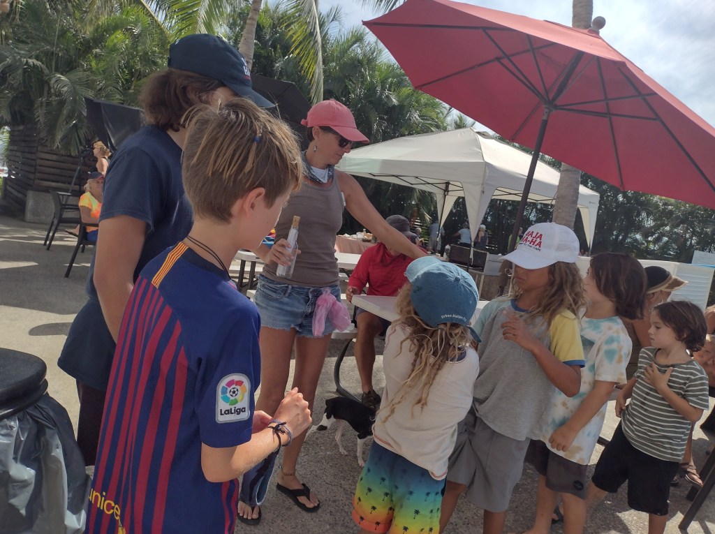 We spent 3 days at Isla Ixtapa enjoying the small island off the mainland and the relatively calm anchorage. The other two kids boats eventually showed up and we had a great beach day playing in the sand and exploring the island. Zihuatanejo is just around the corner and we all sailed there after our final beach day. Zihuatanejo is a really great town with beautiful, lush, green hills all around. The town has an incredible market with straight from the farm, picked yesterday produce. There are beautiful walking trails throughout town. The Murphy crew all agree Zihuatanejo’s malecon is the best we have seen. It meanders along the beach around large rocks up and over massive boulders back along the sand and into town. It is simply beautiful. There is also a large community area with a sunken full-sized basketball court. Every night is seems there is some kind of community gathering. It is a wonderful place to visit and you quickly can be immersed into the community’s happenings. Oh, and there is a pickleball group that plays every morning and you all know I am there too.