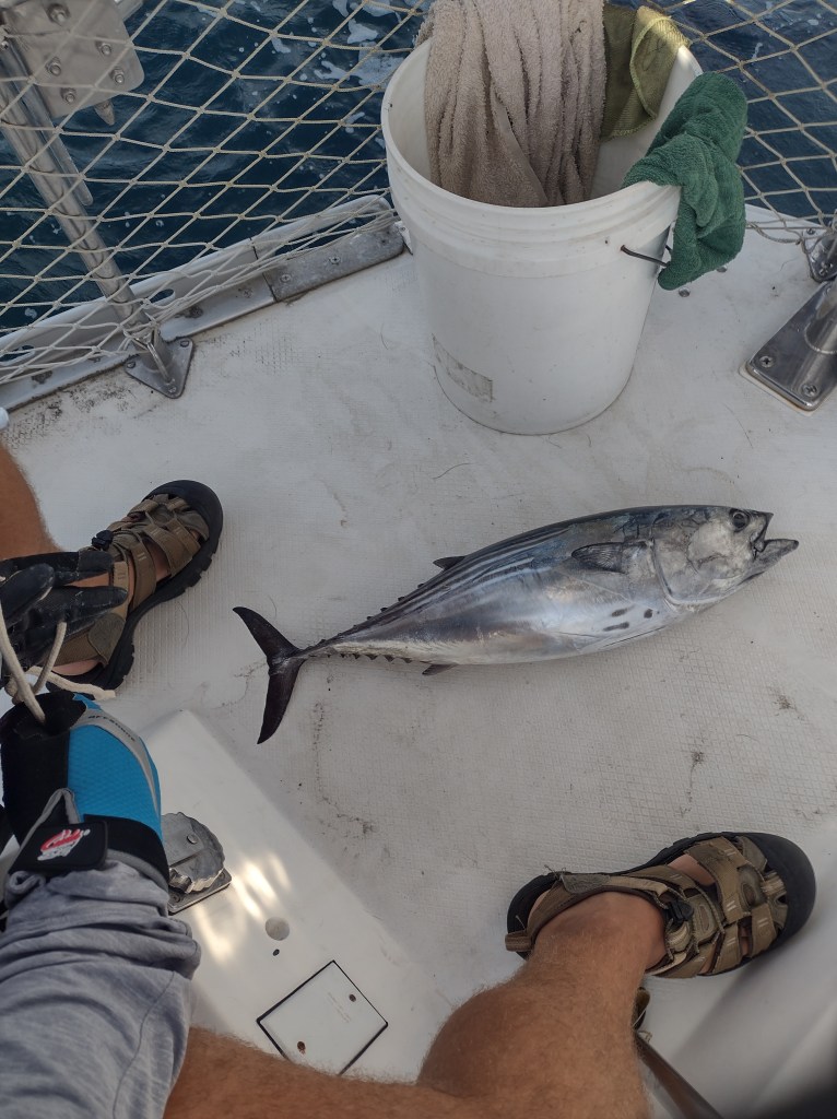 Anyone who has sailed a boat in the ocean at night knows that one of the jobs in the morning is to check the decks for dead flying fish. If you don’t find them early you will find them as soon as it gets warm because your boat’s decks will wreak of dead fish. You see, flying fish are attracted to the lights of a boat at night and they often land on deck and get stuck on any number of ropes, cleats etc on deck. We do not have that problem because our netting keeps them from landing on our decks. But every once in a while one comes in at just the right angle and manages to land on deck. This is what happened the very next morning. The kids found the dead flying fish and normally would just throw it over the side. This time they asked if we could cut it up and feed it to the cats. So that is what we did. The cats went ballistic for the few bites of fresh meat and the kids both agreed we should give fishing a try. I should have planted a bait fish up there long ago.