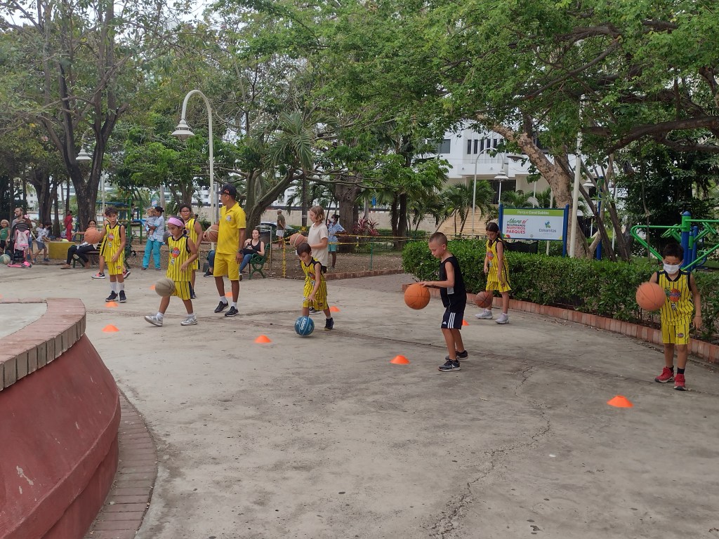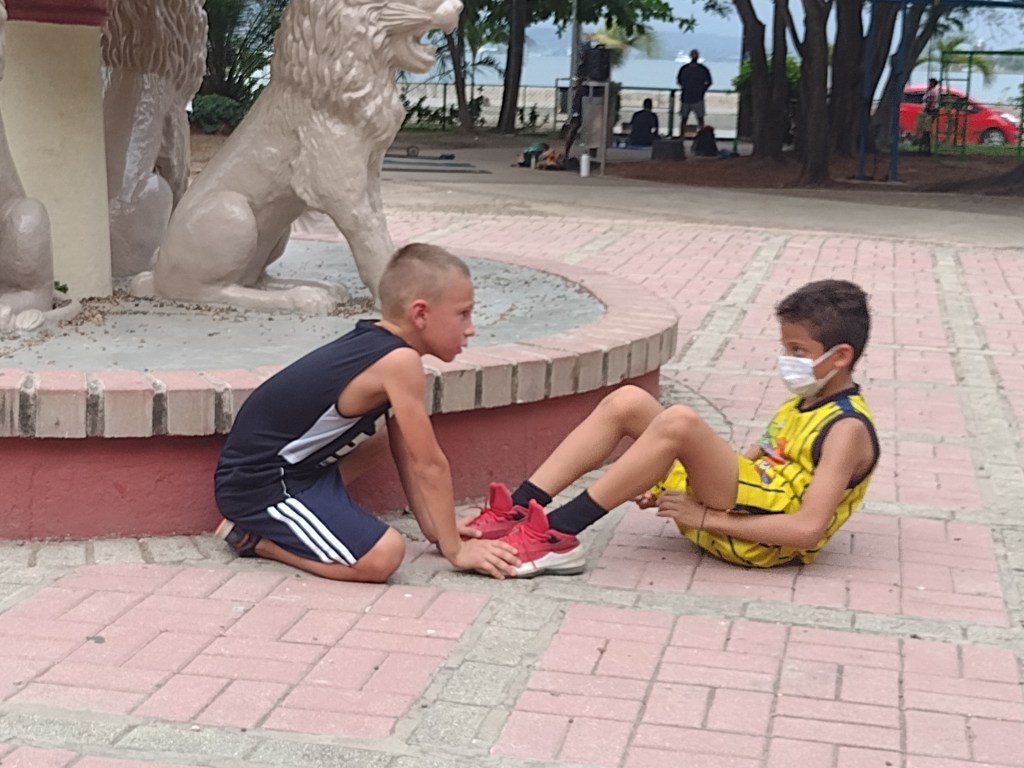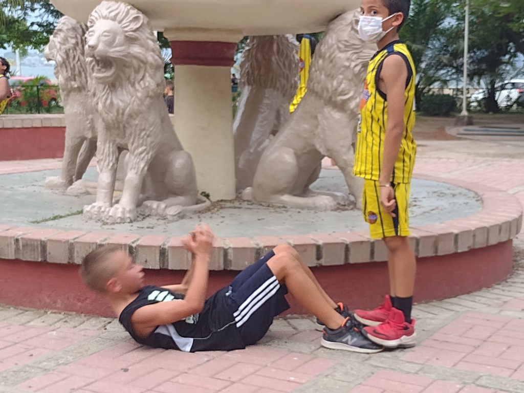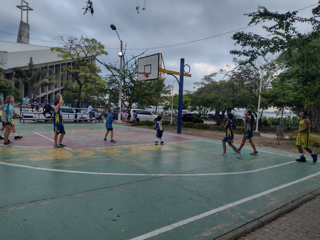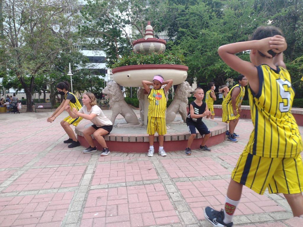 Being tied to a dock was a nice treat and really made things a little more convenient. Taking Ranger to shore each day is much easier when it does not involve a dinghy ride to and from shore two or three times a day. Now we just walked up to the yard for Ranger to do his business. The other plus was that we could use our A/C! Ranger particularly appreciated that little bonus as well. And there was one more even better plus to this marina. Actually, there are 6 more pluses to this marina. Kids! There were four other kid boats here and Alexander and Victoria wasted absolutely no time at all becoming part of the gang. The gang of 8 kids, ages from 8 to 14, loved swimming and playing on the docks, on the boats and in the water. We had U.S. kids, Canadian kids, Polish kid, and Swedish kid and they were laughing and playing at all hours of the day. It was a great group of boating families. Groups of us ran errands together, played basketball at the park together and had dinners together many nights. We also helped each other with projects and or advise on projects. One of these families had been in Colombia for over a year now. This family told us about a basketball league that welcomed anyone to their practices regardless of experience. Ashley and I thought this would be a excellent opportunity for our kids to be part of a sports team. Alexander and Victoria were thrilled to get the chance to play on a real team with kids their own age. We attended the practices three times a week. The team consisted of about 35 kids ranging in age from 5 to 18. The coaches break the kids up by size and skill into three groups and take turns with the court and an area for drills next to the courts. In one group the kids work on various drills to improve their fundamentals, the second group they do various basketball conditioning drills such as running, sit ups and box jumps. Needless to say Alexander and Victoria dominate this part of practice. And the final group is where they scrimmage. The entire practice is very well organized and the coaches are very encouraging and welcoming. They do not speak English, however, so it is sometimes a challenge for Victoria and Alexander to know what is going on as they speak quickly and do not repeat themselves for the two gringos in the group. As always Victoria and Alexander make it happen and they figure it out, either by their grasp of Spanish or watching and learning from the other kids on the team. It is really great watching them work hard physically as well as mentally to keep up with ever changing drills and exercises. We practiced with the team for a little over a month. Both Victoria and Alexander’s basketball skills have improved by leaps and bounds. J