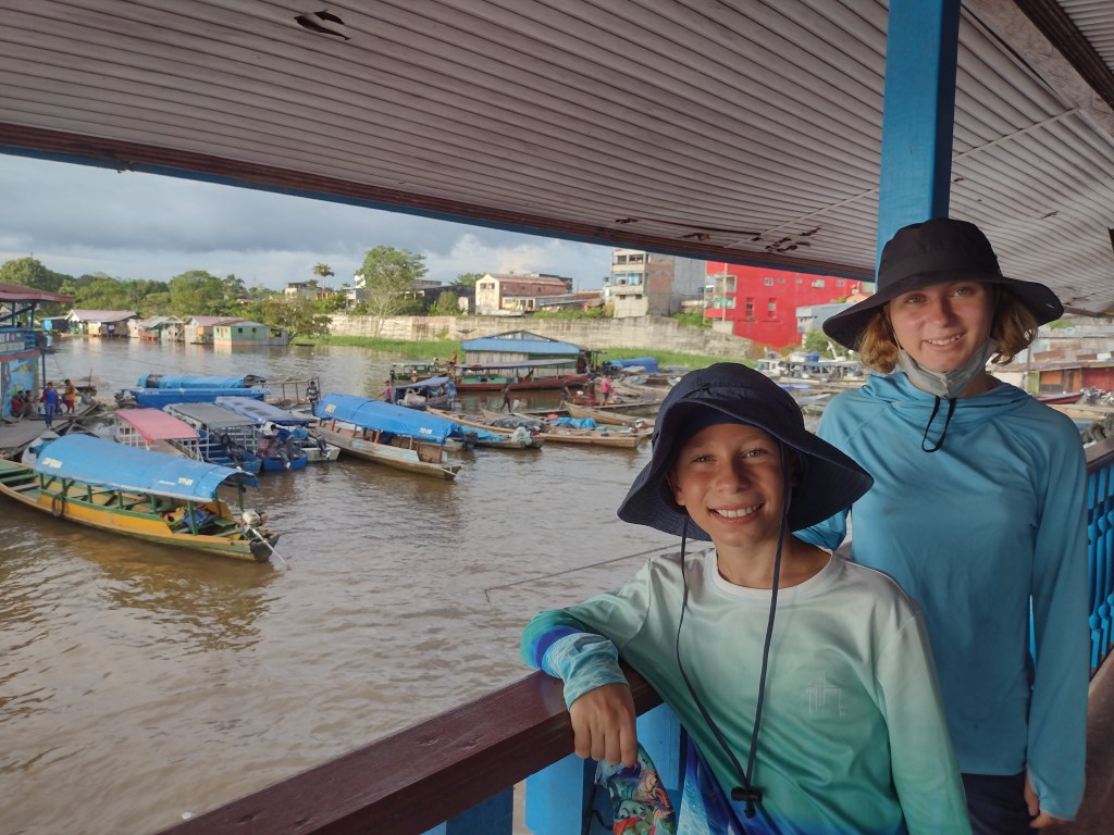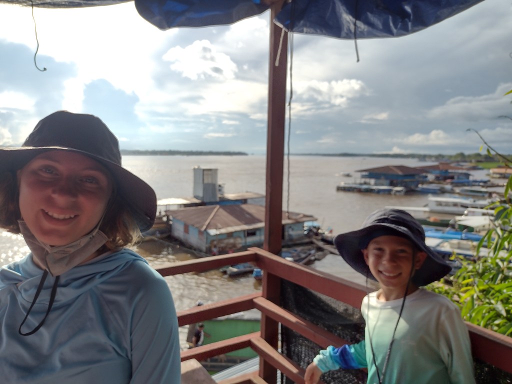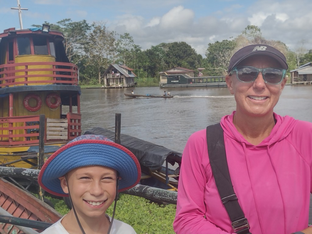 With the ongoing boat project taking nearly 40 days, we had a little time to kill. So Ashley put together a tour of the Amazon Rainforest. We had to schedule at least 2 weeks in advance but we also needed to be back to the boat as the project began to wrap up for any last minute hang-ups or decisions. Therefore, we decided on a whirlwind one week tour of the Colombian and Peruvian parts of the Amazon. We found a pet sitter to watch Ranger and left the cats to their own devises with three extra litter boxes and tons of food and water. Ranger got to go live with a nice lady who had extra cold A/C so he was more than happy to avoid the heat and humidity of the jungle. We flew to the southern-most city in Colombia which is on the border with Brazil. Our first two nights were in a small hotel in the city of Leticia. It was a nice hotel right in the middle of the city and about 5 blocks from the river and less than 2 km from the Brazilian border. We spent time exploring the city and looking at all the different ways that the river is used by the residents. We visited neighborhoods that are built right up to and then onto the river’s edge. These houses were built on stilts just above the highest of high water and had scaffolding like walkways between them and their neighbors. During the high water season, which is was at the time of our visit; many of the residents had their boats tied up to their homes. Also the kids could be seen swimming around their houses with friends and pets. In town there was a bustling market selling the many different kinds of fish and fruits harvested from the nearby river and forest. We ate at a couple different restaurants sampling the different kind of fresh water fish. It was all fantastic! The fruits were all new to us and they too were amazing. We met a street vender named Monica who lived in Leticia her entire life. She was selling two kinds of juice. One was limonade from freshly squeezed limes right there in front of you. Alexander and I ordered five of them, one for each of us and one for the homeless person nearby. After guzzling down this amazing drink Alexander and I went back for seconds. However, this time we both thought we would try the other “juice”. Now we have no clue as to what kinds of things she was cutting up, squeezing and pressing. We did see fresh limes and recognized the fresh coconut spears but that was it. There were at least 6 other fruits that she added to this drink but we had no idea what they were. But the end result was simply amazing!