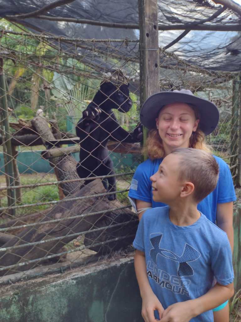 Our most notable adventure while in the Rio Dulce is still top of mind for all four of us. It began with an evening in the resort’s pool. Victoria, Alexander and I were playing catch with a football in the pool one evening. I struck up a conversation with a nice couple from Guatemala City. We discussed our traveling and our lifestyle. We discussed Guatemala and the opportunities for work in Guatemala. This wonderful couple told me of their son’s work in medicine as well as their daughters work in Veterinary medicine. The reason for their visit to Rio Dulce was to visit her at the animal sanctuary that she worked for. They told me that she may be able to give us a tour of the work that they do. Kathie gave me her phone number and told me to text her when we would like to stop by and see some animals and that she would find a way to show us around. A week later we drove out to the large nature reserve that is set aside to protect these animals in need. Kathie is a veterinarian tasked with taking care of various animals recovered from illegal activities, injured or no longer wanted from zoos. She met us at the gates and hopped into our car. We had zero expectations as to what we would experience so we just played along to see what we would see. The first area that she took us to had many kinds of birds, lizards, monkeys, deer, and an ocelot. But the one, Murphy family favorite, that stood out and made our day were the river otters. They had four river otters that would come right up to the fence for us to see and hear. They were absolutely adorable! And I am certain Kathie thought the four of us were nuts with how excited be all got to see otters so up close and personal. We could have stayed there all day. When we left that area the four of us thought we could go home right now and this day would be amazing. We had much more excitement ahead. After leaving the otters we drove to an enclosure near a medical facility. Kathie said she wanted to introduce us to someone she works with. The four of us were still flying high from our otter encounter that we barely noticed the black ball of fur hiding in the bushing inside the enclosure. Kathie pointed to the dark spot in the bushes and called out for Moana. Moana burst out of the bushes, at full speed and right up to the fence. Moana was a four month old black panther! Kathie stuck her fingers through the chainlink fence and Moana immediately began licking and rubbing against Kathie’s hands. Having forgotten about the otters, the four of us just stood there in awe at the fact that an adorable baby black panther was inches away from us and our friend Kathie was petting it! She turned to us and said you can pet her too. There was no hesitation, instantly we all were scratching and rubbing this amazing animal thru the fence. It was simply amazing. Moana was just perfect. She was excited to be pet and was very gentle. She would lick my hands and rub her face and ears on all of our hands. I could not believe we were there petting such an amazing animal. When it finally came time to say goodbye to Moana, we all got back into the car and headed to our next stop. However, after first the otters and then Moana, I didn’t see how this day could get any better. I guess I hadn’t met Simba yet! We continued to the next area of enclosures where they keep the large cats. She told us they have a tiger, 2 leopards, another panther and a lion. These enclosures are similar to what you would see in a zoo. Only they are much, much larger and not designed for the animal to be seen by crowds. This sanctuary is not open to the public and exists to help the animals not put them on display. So it was not a surprise or a disappointment when we did not see the tiger or one of the leopards. We did see the lion. He was sitting up on a raised platform about 6 feet off the ground and watching casually us as we wondered the area. When we finally turned toward his enclosure his demeanor of indifference toward us changed drastically. We were about 20 feet from his enclosure and walking toward it when all of a sudden he rose and raced toward the gate in front of us. His speed was incredible! The gate was thick enough to hold an elephant and at least 15 feet high but I was very nervous being so close to this animal after seeing it move so effortlessly. The four of us stopped about 10 feet from the gate as Kathie continued right up to the bars. This huge male lion eyeballed us sternly but then quickly relaxed and began acting like a big house cat. Kathie reached through the bars and called him over! He ran up to the bars and leaned his back up against her hands and she began scratching him all over! She turned to us and said you can pet him too it you would like. Now this was no 4 month old little ball of fur. This was a full grown 400lb male lion! There was some hesitation this time. But soon all four of us were reaching through the bars and petting this lion. And I don’t mean we touch it a pulled back quickly. I mean I am rubbing his mane and scratching his back and neck! And he loved all of it. He was just like a cat whose owner has been away at work all day. It was simply incredible to have all four of us there petting a lion! Kathie showed us more animals, we walked among zebras and antelope. We played footsy with a full grown black panther, and we had a staring contest with a full grown ostrich. The day was more that we could ever have imagined and we have been talking about Moana and Simba (the lion) ever since. Thank you again Kathie for a experience we will never forget! And thank you Eduardo and Carmen for introducing us to your wonderful daughter!