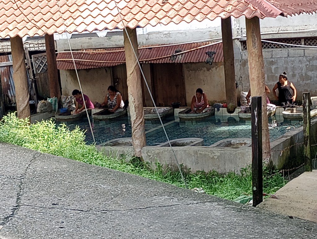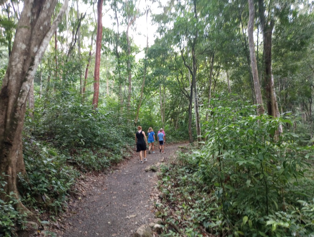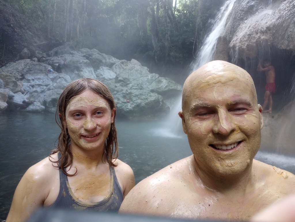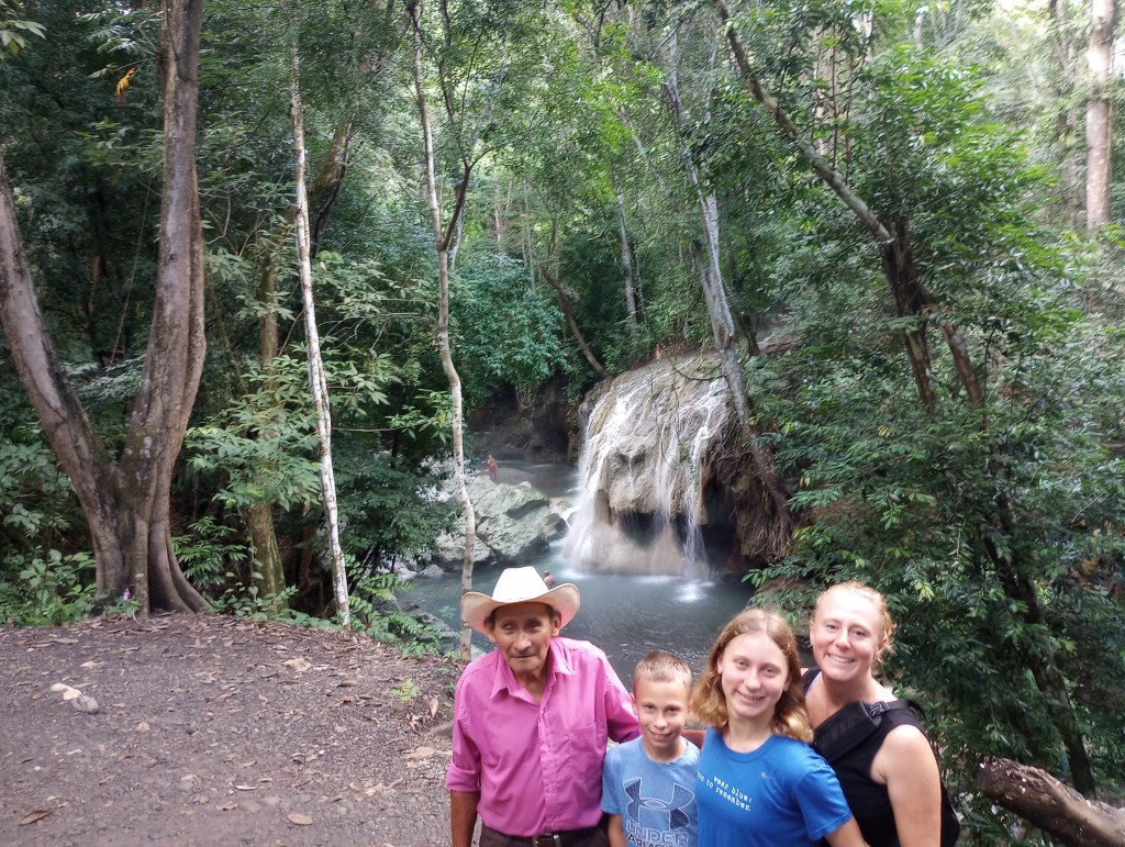 We thought that Samadhi would be finished a little sooner that she was so we sold our car as soon as we arrived in the Rio Dulce. That turned out to be a bit of a mistake. So for any longer trips we had to rent a car. One such trip was to visit a waterfall of geothermally heated water that falls into a cold river flowing perpendicular to the falls. It was about an hour drive from our hotel to the trailhead. We found the trailhead parking where we were met by a group of 4 girls from the small village nearby. As soon as we got out of the car they offered to guard our car while we visited the falls. They each wanted one Quetzal (about $.20). During our negotiations of a 1 Quetzal plus one song to be sung all four girls got the googley eyes for Alexander. They soon forgot about the Quetzal and just wanted to look at and giggle about Alexander. They were absolutely adorable. They did sing us a song from their school and I gave them each 10 Quetzales. We were joined by a nice old man from the village who hiked back to the falls. He wanted to make sure that we go there safely and picked a good spot to swim and enjoy ourselves. We tipped him too and thanked him for helping us find the only falls at the end of the trail. Oh well, he was a very nice man and it is always good to support the local economy. After we waded out into the cool water we crossed the river to the roaring falls of the hot water. The hot water cascaded over large rocks and into a nice waist deep pool of now warm water. The hot water was just a degree or two from being too hot to stand. My guess would be that the temperature was about 110-120 degrees. The water in the river was about 70 degrees so it made for a perfect combination. The mud from the river was said to be great for the skin and many people there were rubbing it all over their bodies. So when in Rome… When we got back to the car Alexander’s fan club was waiting to continue their flirting and giggling. I offered to take their pictures and they jumped at the opportunity. They were very sweet and Alexander, though very much embarrassed, was a good sport and smiled for the pictures.