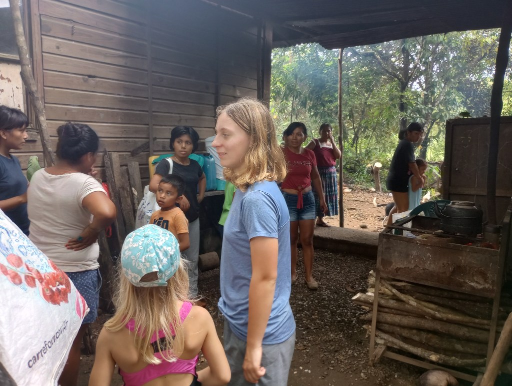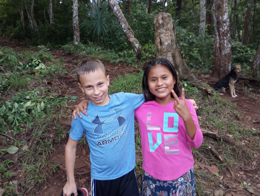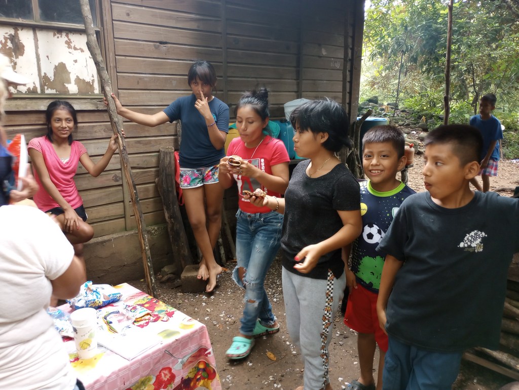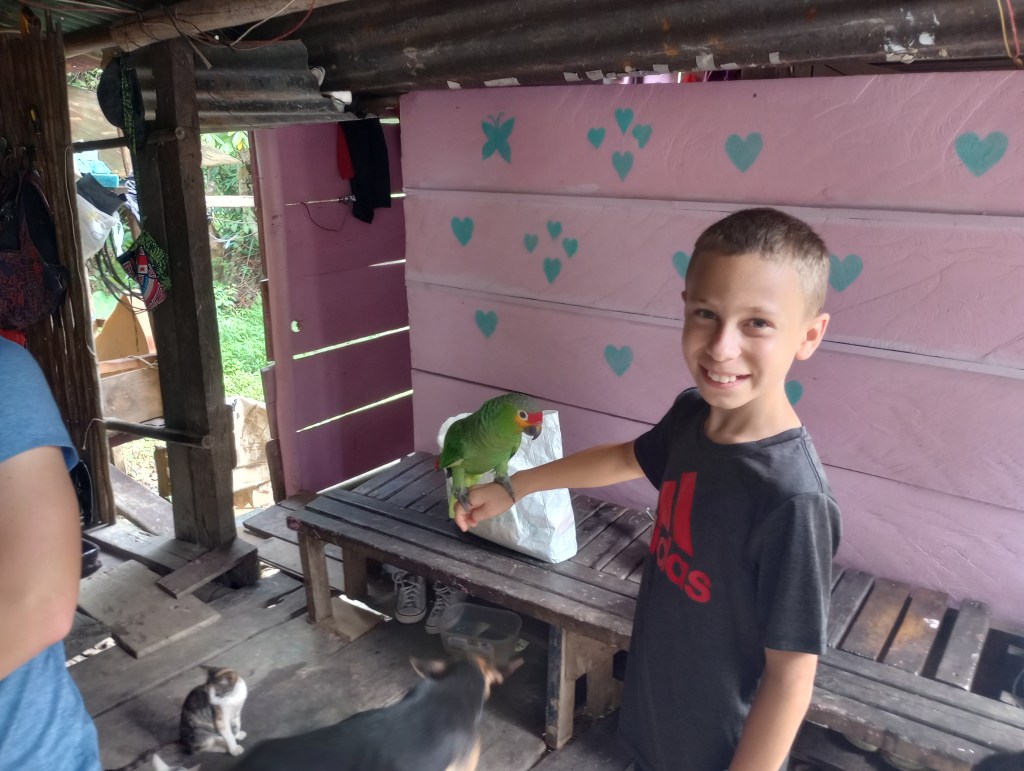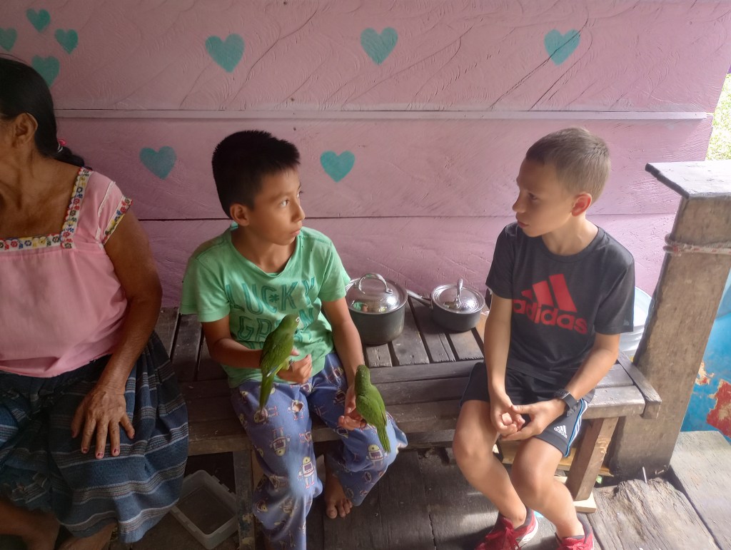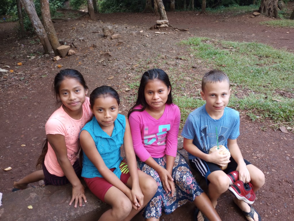 Thru other cruisers, who have been coming to the Rio Dulce for 15 years, we were able to see how some of the local Mayan people live on the river. Our cruiser friends asked the cruising community if they had anything that could be donated. We had lots of clothes and some school supplies that Victoria and Alexander no longer needed or used. So we joined a small flotilla to visit some Mayan homes along the river. Our first stop was a home built on stilts to accommodate the rising and falling of the water levels throughout the year. The family was very welcoming to show us their home and had many pets to introduce us to as well. They had new puppies and kittens and also a big parrot and 2 parakeets. We brought them some art supplies and clothing and they were very appreciative. This family spoke zero English so communication was a little difficult but Victoria stepped right up and translated for all the cruisers. She was quickly the center of attention as they do not meet many gringo kids that speak Spanish so fluently very often. Another of the homes that we visited offered to cook us lunch and gave us a small tour of the property that they lived on. It was beautiful thick jungle right along the river. They too had many animals including two young raccoons. These little cuties were very curious and always looking for food. They would climb right up my legs to see if I had anything to feed them. Here, too, Victoria was the center of attention as her language skills allowed her to fit right in and have fluid conversations with the Mayan families; both kids and adults.