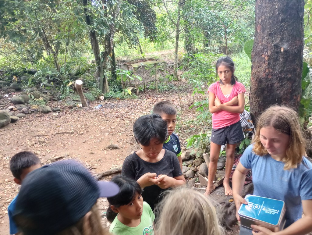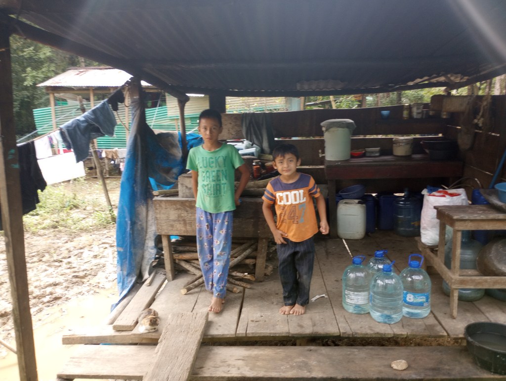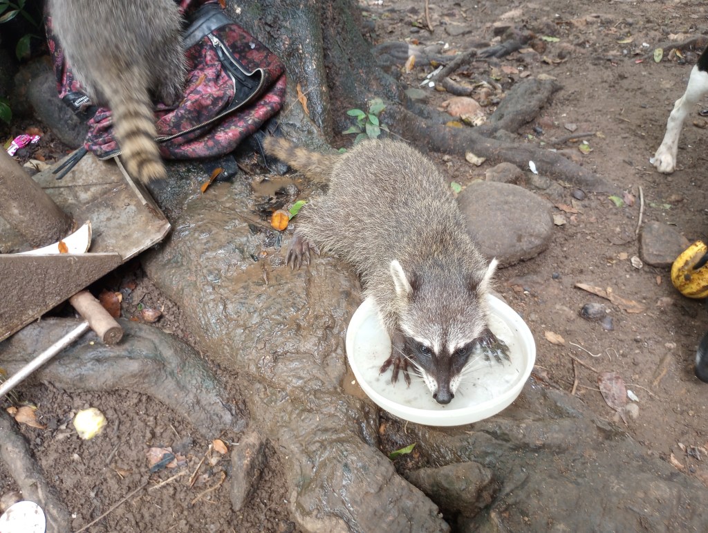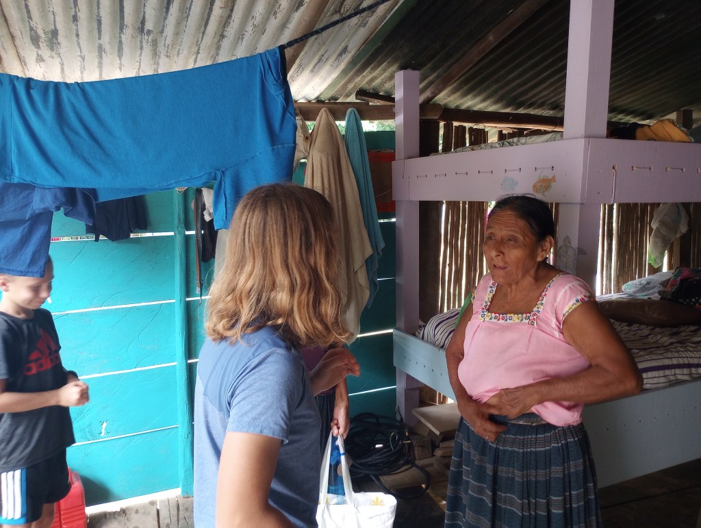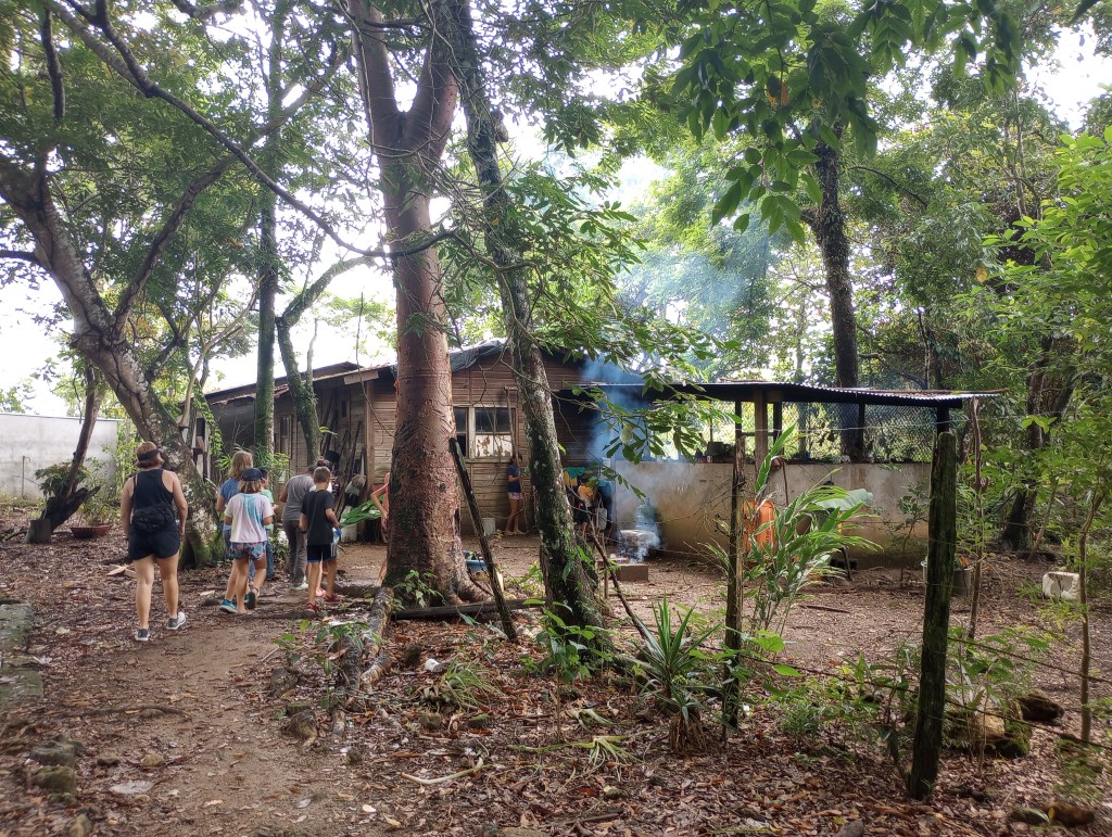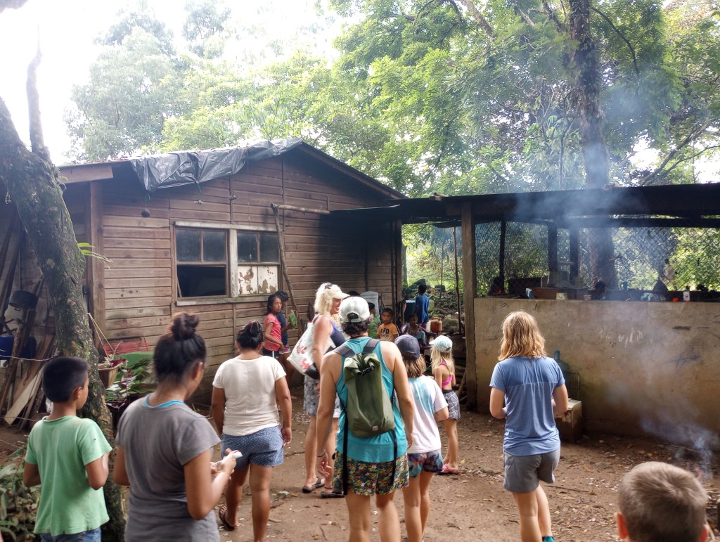 Thru other cruisers, who have been coming to the Rio Dulce for 15 years, we were able to see how some of the local Mayan people live on the river. Our cruiser friends asked the cruising community if they had anything that could be donated. We had lots of clothes and some school supplies that Victoria and Alexander no longer needed or used. So we joined a small flotilla to visit some Mayan homes along the river. Our first stop was a home built on stilts to accommodate the rising and falling of the water levels throughout the year. The family was very welcoming to show us their home and had many pets to introduce us to as well. They had new puppies and kittens and also a big parrot and 2 parakeets. We brought them some art supplies and clothing and they were very appreciative. This family spoke zero English so communication was a little difficult but Victoria stepped right up and translated for all the cruisers. She was quickly the center of attention as they do not meet many gringo kids that speak Spanish so fluently very often. Another of the homes that we visited offered to cook us lunch and gave us a small tour of the property that they lived on. It was beautiful thick jungle right along the river. They too had many animals including two young raccoons. These little cuties were very curious and always looking for food. They would climb right up my legs to see if I had anything to feed them. Here, too, Victoria was the center of attention as her language skills allowed her to fit right in and have fluid conversations with the Mayan families; both kids and adults.