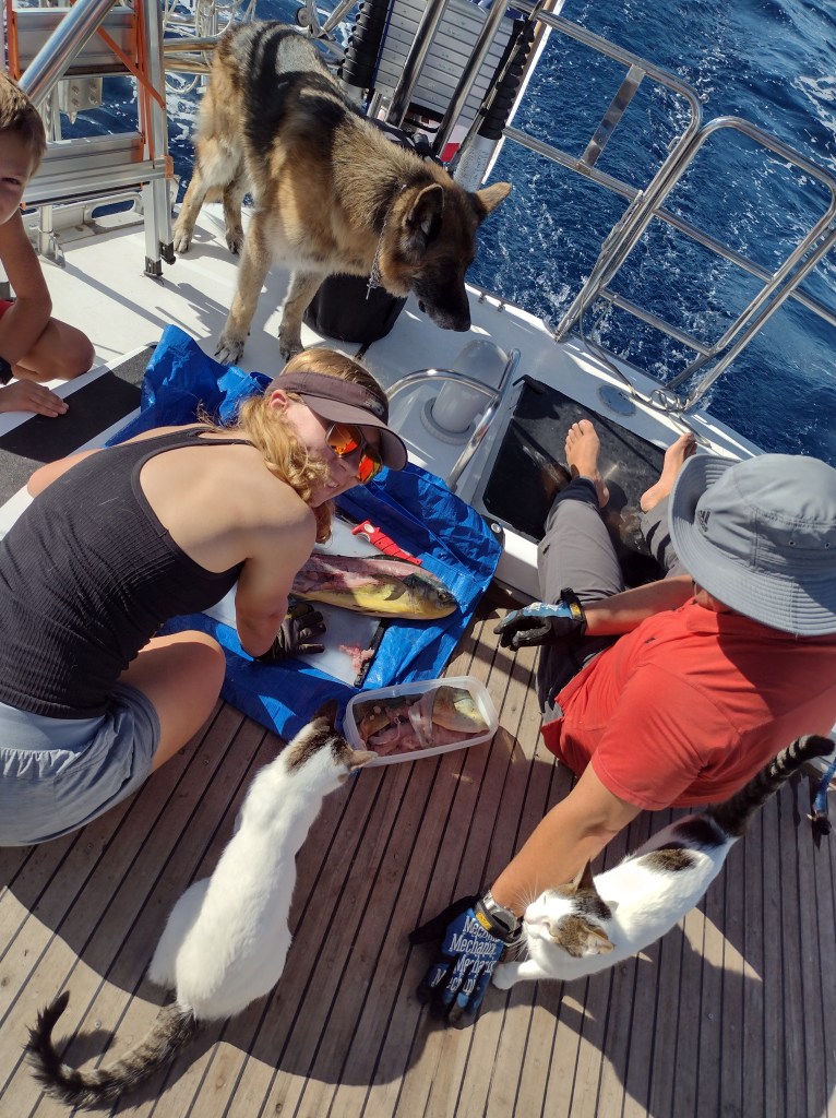 We had a beautiful day sail to Chubb Cay where we checked into the country and topped off with fuel. Ouch fuel in the Bahamas was nearly $9.00 a gallon! The next day we again had a fantastic sail to Nassau and caught our first mahi-mahi just before entering the harbor. We spent two days in Nassau provisioning and taking in the sights of city. Next we sailed around to the south side of Nassau out of the town to a popular bay with an amazing beach and crystal clear waters. We swam in the warm, clear waters every few hours on our school breaks. We caught our first lobster just behind where Samadhi was anchored. Victoria spotted it and I went down and netted it, after a few tries.