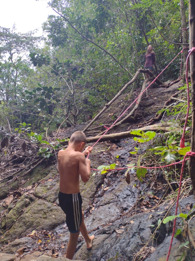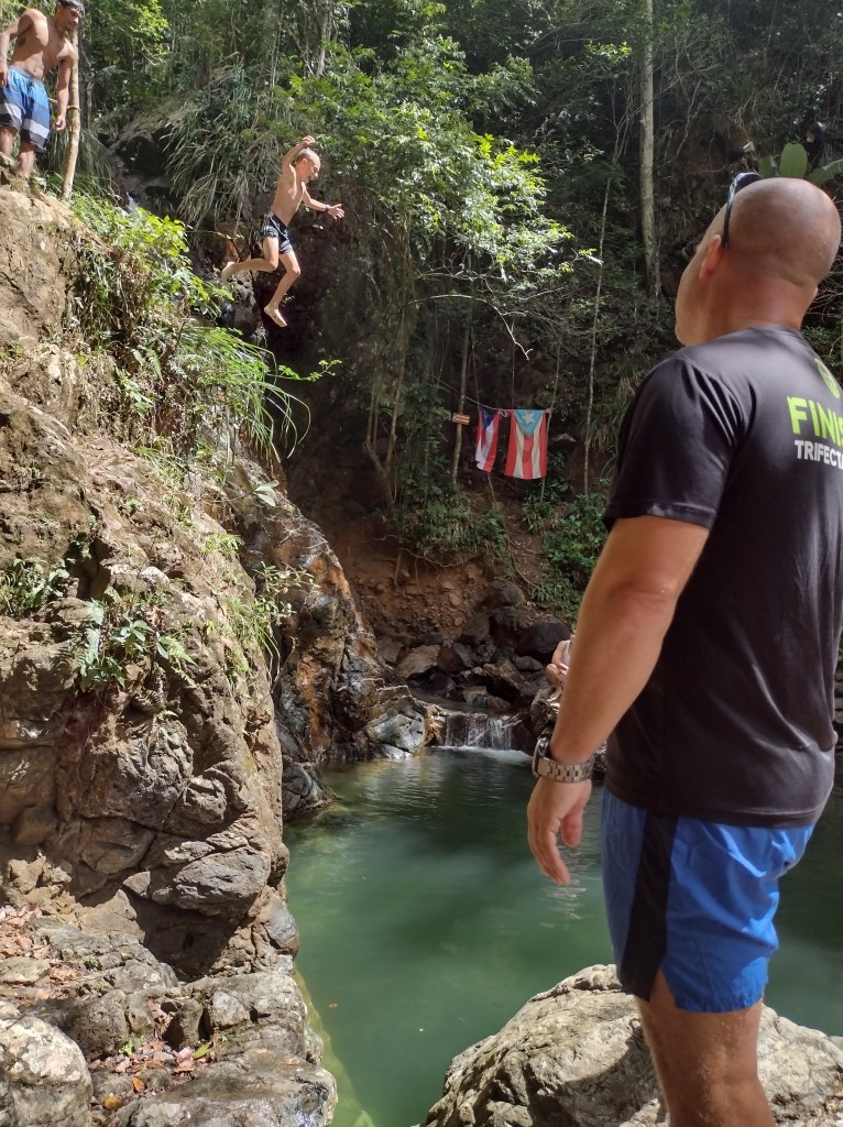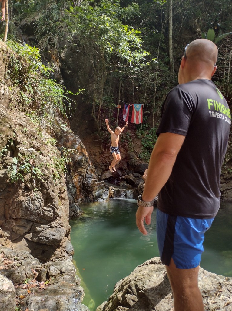 There was a group of 5 young men at the pool when we arrived. Their backpacks were camouflage with US Army badges on them. I assumed they were members of the National Guard in Puerto Rico. Two of these men were swimming in the pool and calling up to the other three as they very hesitantly climbed the cliff face up to a small ledge about 15 feet up. Victoria, Alexander, and I all jumped into the pool and swam around while looking up at the men above us. Their friends below were trying to get them to jump but were not succeeding. Alexander asked if he could climb up and try it. I told him that if he climbed up he would have to jump because the climb was a tough one and it would be nearly impossible to climb down. He looked over his shoulder at me with that big, cocky smile as he was already on his way up the cliff side. It took the men about 5 minutes and lots of egging on from below to make the climb with their shoes on. When Alexander started climbing the men all told him it was dangerous and slippery and very high and that he should wear his shoes. Anyone who know Alex, know that the first thing he did was take off is shoes. They were all very nice to him but giving their buddies a hard time for refusing to jump. One was evening trying to find a way to climb back down. And then Alex climbed the rock like a monkey chasing a banana up a tree. He was to the ledge where the three men were standing in less than a minute. He asked if he could go first and they all stepped aside as he carefully approached the edge, looked over at me with that cocky grin, looked back at the men with an even cockier grin and jumped! The men below were a little worried at first but when Alex burst out of the water with a huge smile and immediately began climbing the cliff again they all relaxed and let their buddies have it! Alex got to the top again as the other three now found a little more courage if not motivation to jump. Two of them did but one still hesitated. Alexander calmly told him it was not so bad and not as high as it looks. Alex then jumped again as the four men and the rest of the hikers down below all cheered on the last man. He finally jumped and they all cheered for him. All five of the young men came up to Alexander and high fived him and thanked him for showing them the way. Our interaction with the young men was only a sample of how everyone there was so friendly and interactive. There were probably 3 or 4 different groups of hikers at the pool and everyone was chatting with everyone. Hiking would not exactly be considered an overly social activity in most places. In Puerto Rico, a small pool below a beautiful waterfall in the middle of a lush rainforest is just another place to meet and get to know new people.